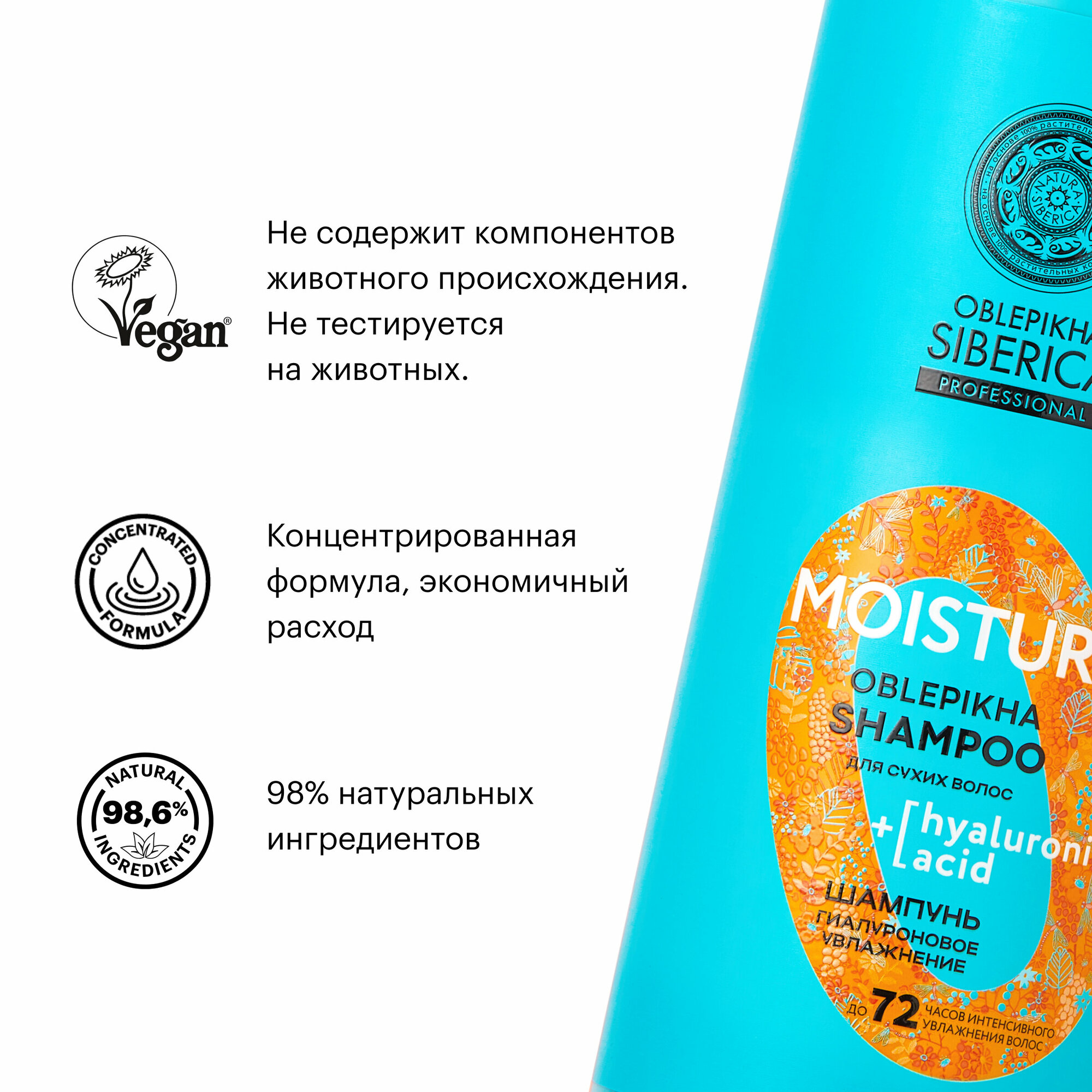 Придает волосам гладкость и сияние. Гиалуроновая кислота оказывает интенсивный увлажняющий эффект, так как обладает способностью активно удерживать влагу. Масло Алтайской облепихи защищает волосы от обезвоживания. Камчатские Водоросли, Красника Курильская, Уснея Снежная оказывают регенерирующие функции, восстанавливая структуру волос. Pro-Liposome уникальная система транспортировки активных ингредиентов внутрь волоса и кожи головы.