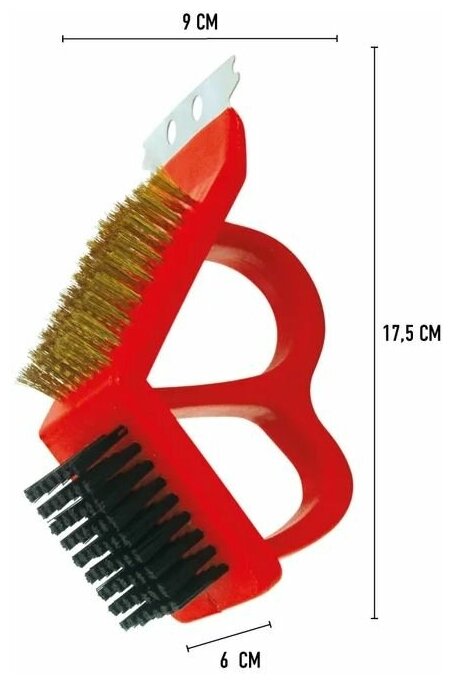 Щетка для чистки гриля и барбекю. Средней жесткости пластиковый ворс удаляет жир с деликатных покрытий. Стальной скребок и медная щетка удаляют пригоревшую пищу и трудно устранимые загрязнения. Специальные пазы предназначены для чистки прутьев решеток-гриль.