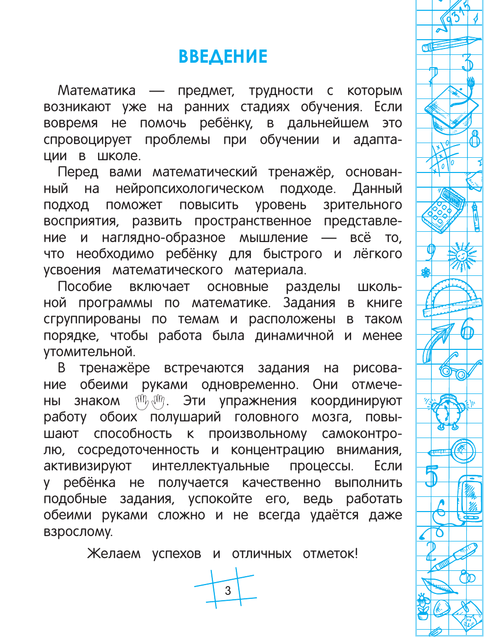 Многофункциональный нейротренажёр, подготовленный математиком совместно с нейропсихологом, с учетом реальных проблем, возникающих при обучении, входит в серию книг издательства «Эксмо» «Занимаемся с нейропсихологом. Нейротренажер для начальной школы». Математика — предмет, трудности с которым могут возникнуть уже на ранних этапах обучения. Если вовремя не помочь ребёнку, то в дальнейшем это спровоцирует проблемы в усвоении не только самого предмета, но и в целом трудности обучения и адаптации в школе. Книга поможет в развитии математических навыков, повышении уровня зрительного восприятия, развитии пространственных представлений и наглядно-образного мышления — всего того, что необходимо ребёнку для быстрого и лёгкого усвоения математического материала и, как следствие — повышения интереса к предмету.