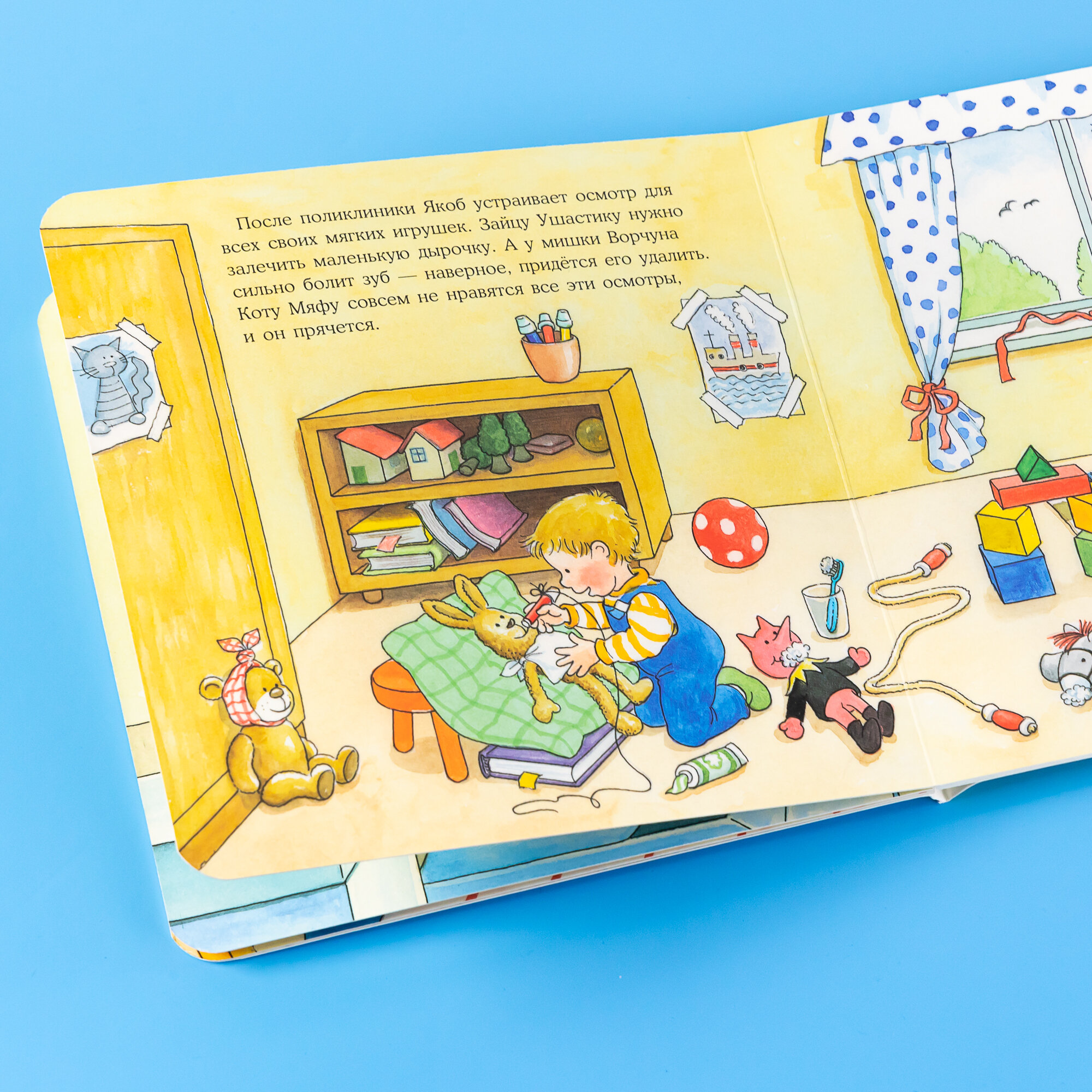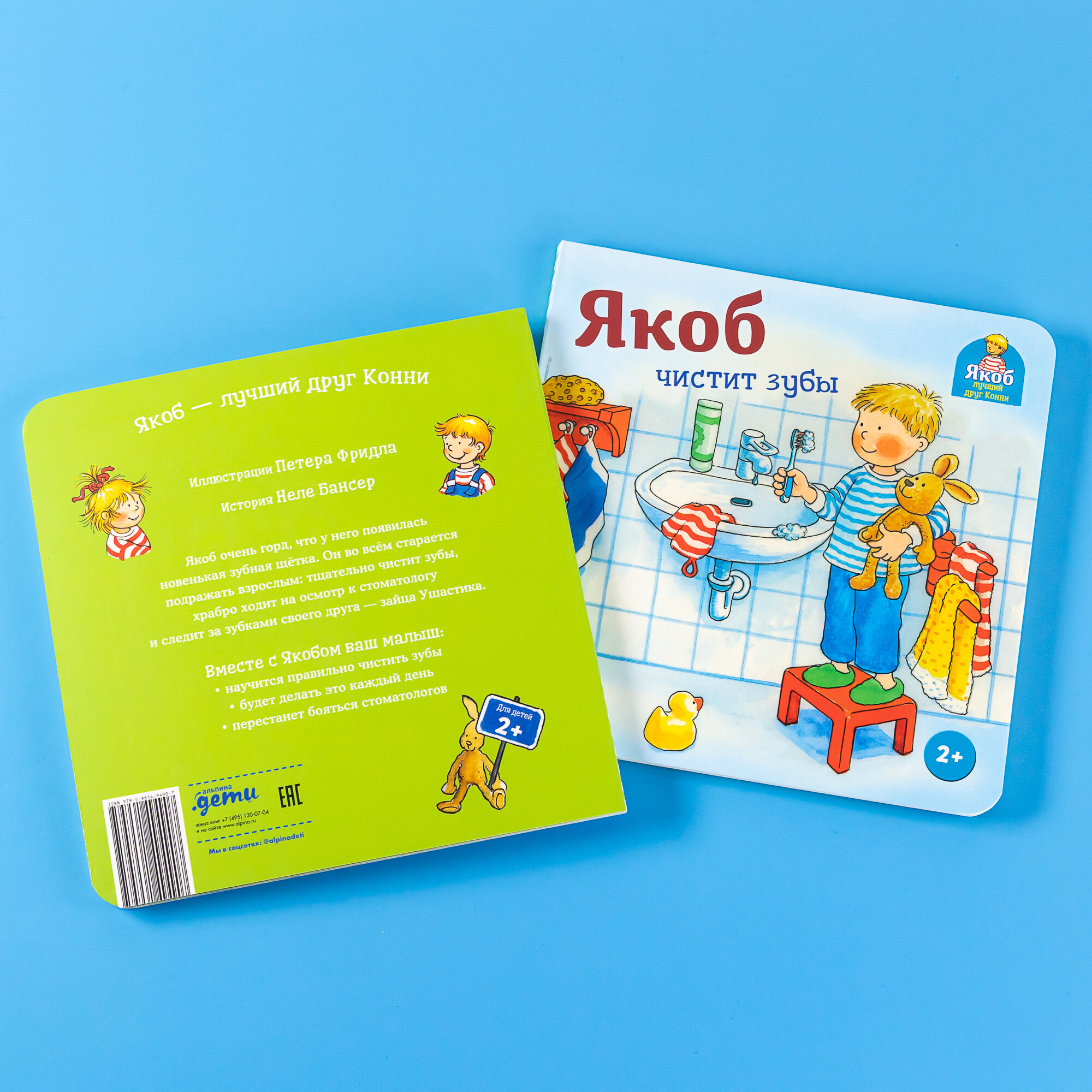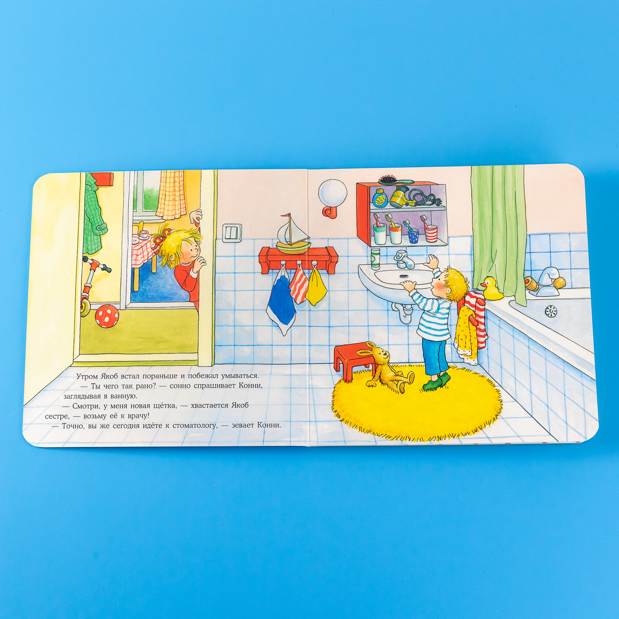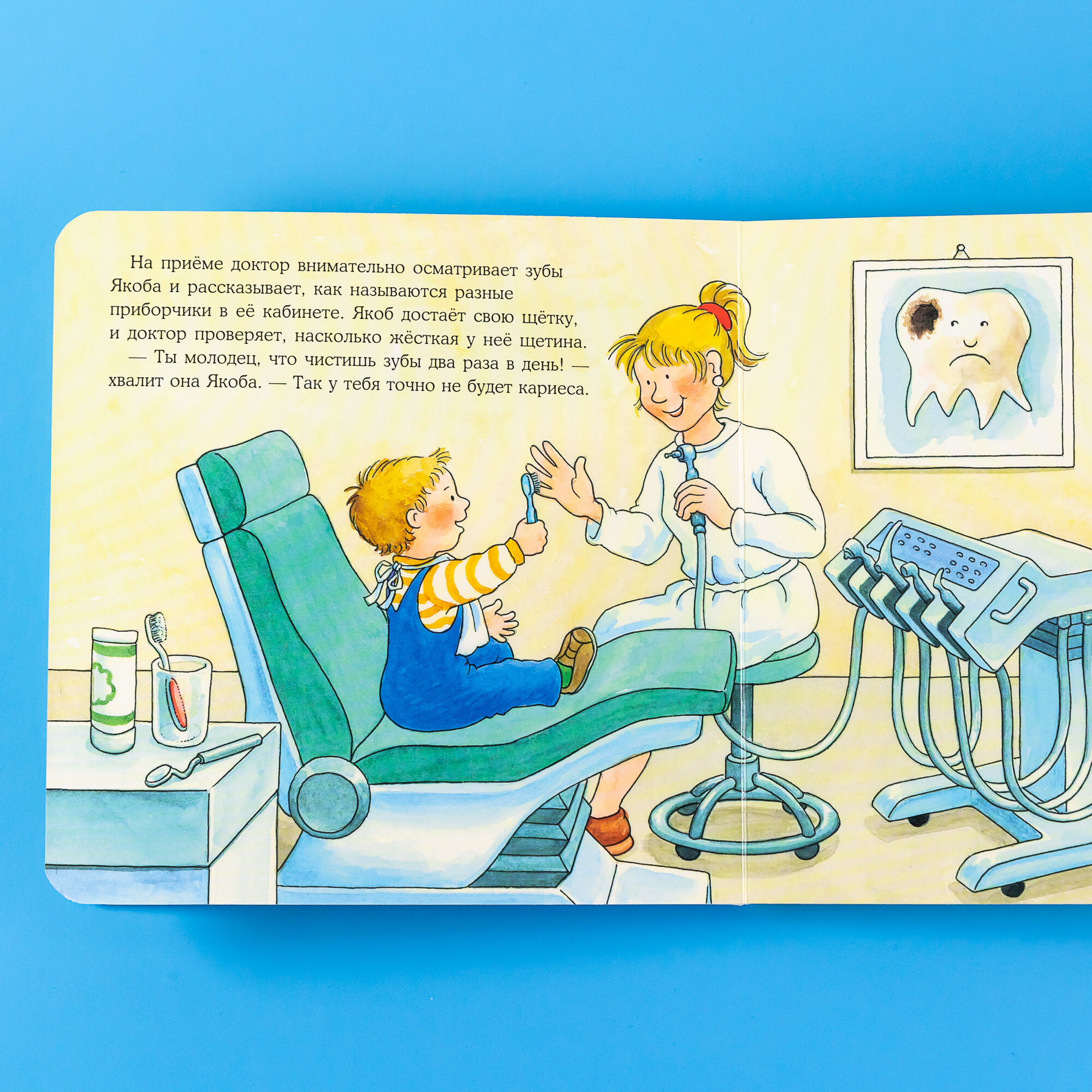 Книга-картонка для самых маленьких Покажет малышу, как важно чистить зубы Расскажет, что происходит на осмотре у стоматолога Научить малыша правильной гигиене полости рта очень важно. Якоб горд, что у него появилась новенькая зубная щетка, совсем как у взрослых. Он во всём старается подражать маме с папой и старшей сестре Конни, поэтому тщательно чистит зубы, храбро ходит на осмотр к стоматологу и следит за зубками своего друга зайца Ушастика. Вместе с этой книгой ваш малыш поймет, как важно чистить зубы, как это делать правильно, и почувствует себя совсем большим. Подходит для совместного чтения с детьми от 2 лет и старше. Цитаты "Утром Якоб встал пораньше и побежал умываться. - Ты чего так рано? - сонно спрашивает Конни, заглядывая в ванную. - Смотри, у меня новая щётка, - хвастается Якоб сестре, - возьму её к врачу!" "На приёме доктор внимательно осматривает зубы Якоба и рассказывает, как называются разные приборчики в её кабинете. Якоб достаёт свою щётку, и доктор проверяет, насколько жёсткая у неё щетина. - Ты молодец, что чистишь зубы два раза в день! - хвалит она Якоба. - Так у тебя точно не будет кариеса." Удобный формат для малышей 2+.