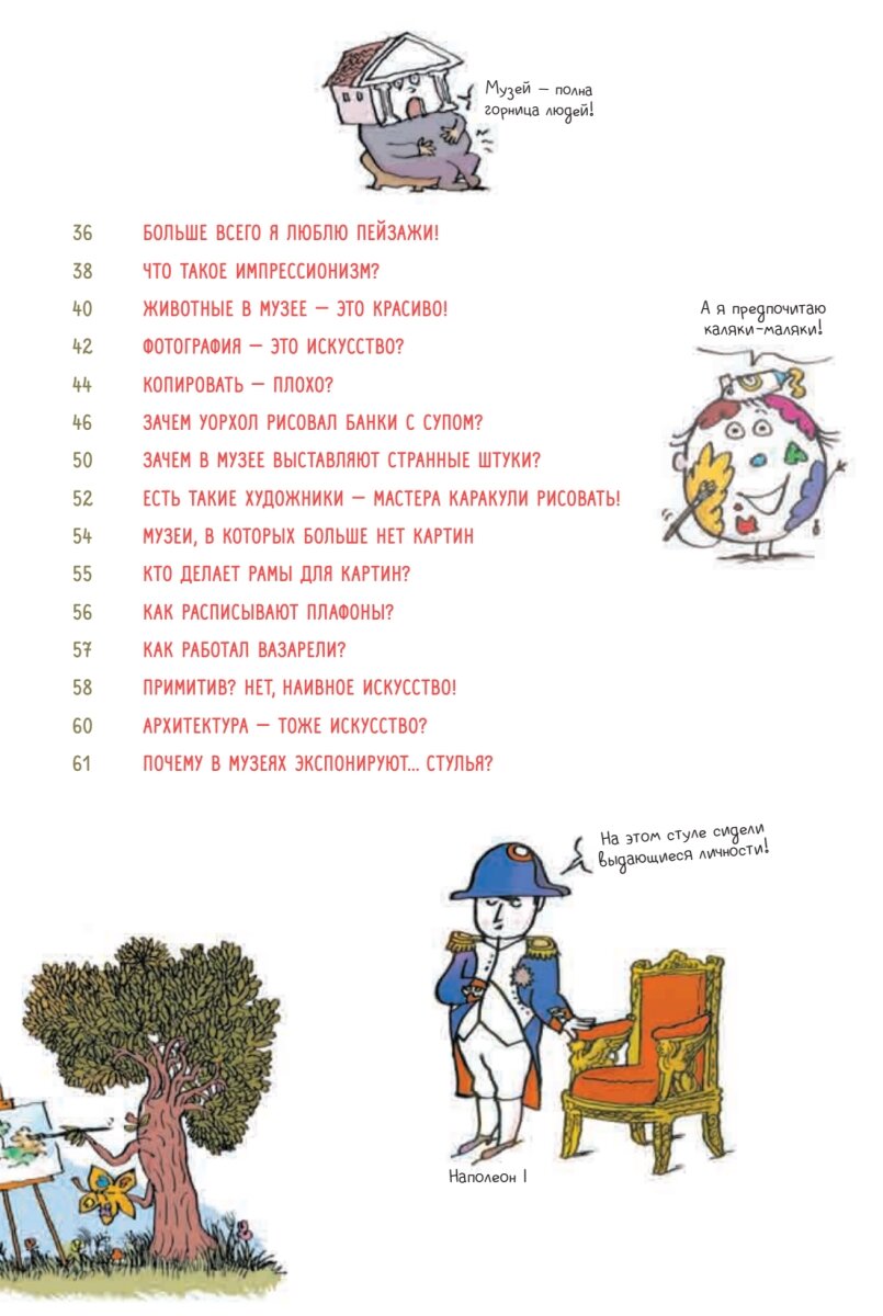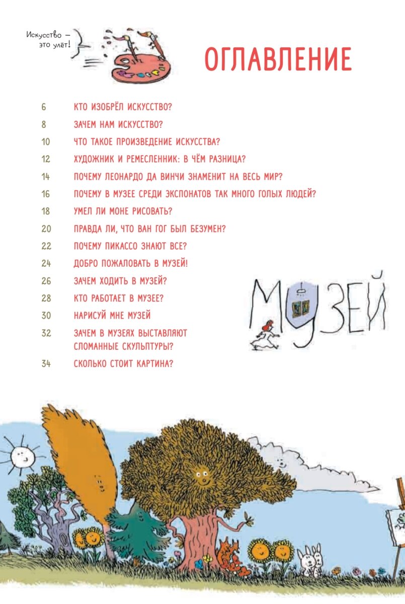 "Зачем нужно искусство? Как Пикассо стал известен во всём мире? Кто придумал музеи? Сколько может стоить картина? Почему в музее выставлены стульяШедевры и художественные стили, факты об известных художниках, выставки и музеи в этой книге много интересной информации об истории искусств. Автор книги искусствовед Полин Понс поможет лучше разобраться в живописи, скульптуре, фотографии, архитектуре и дизайне. А смешные иллюстрации Паскаля Леметра не оставят без улыбки ни ребёнка, ни взрослого."5 причин прочитать эту книгу:Книга подготовлена в сотрудничестве с музеем Орсе, Париж.Материал в формате шуток и комических иллюстраций легко запомнить и сложно забыть.Интересно и познавательно как детям, так и взрослым. Книга может стать отличным поводом для совместного чтения.Актуальная информация обо всем искусстве, от классики до поп-арта, от Леонардо да Винчи до Энди Уорхола.Самые неожиданные и неизвестные факты об известных художниках, скульпторах, фотографах и дизайнерах.