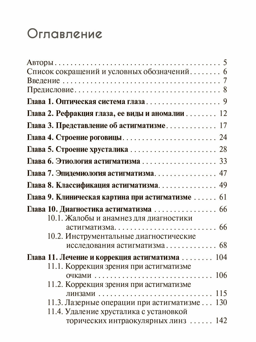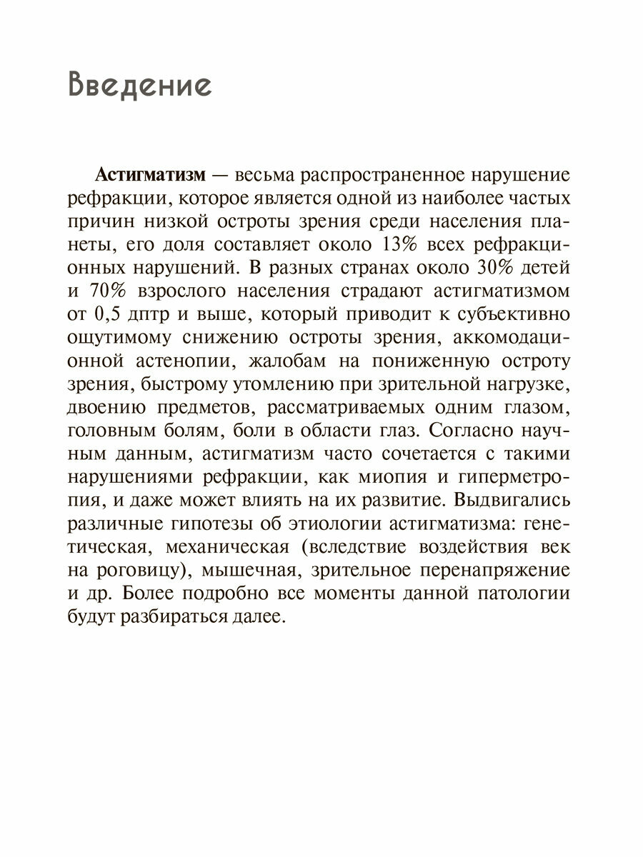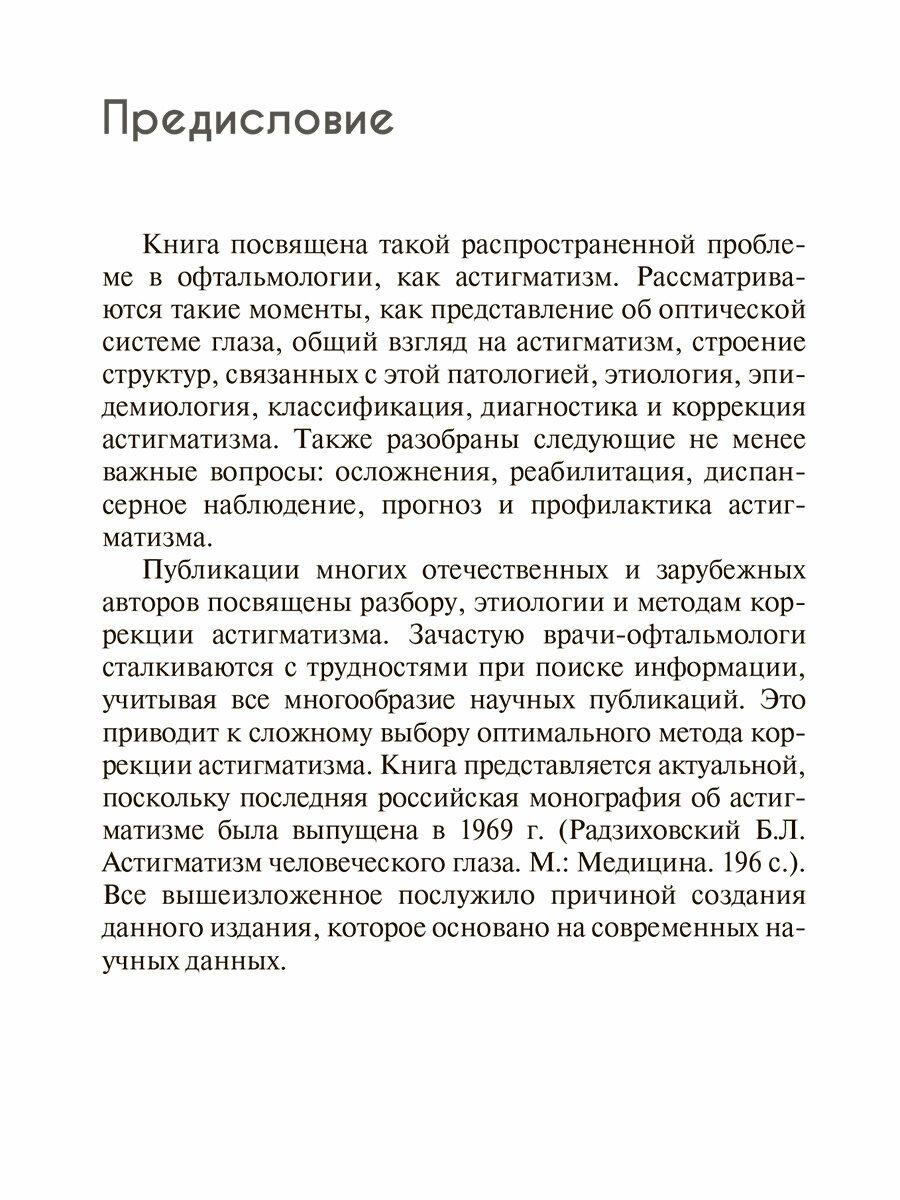 В книге изложены все вопросы, затрагивающие такую патологию рефракции, как астигматизм: общее представление, анатомия структур связанных с развитием астигматизма, подробно разобранная этиология, эпидемиология, классификация и все возможные варианты коррекции с применением, как консервативных, так и хирургических методов, включая возможности лазерной коррекции и замену хрусталика на торическую интраокулярную линзу. Рассмотрены последствия, к которым может привести вовремя не скорригированный астигматизм, его возможная реабилитация, диспансерное наблюдение и прогноз с профилактикой данной патологии. Издание адресовано практикующим врачам-офтальмологам, научным сотрудникам, ординаторам и аспирантам кафедры офтальмологии, врачам смежных специальностей и студентам медицинских вузов.