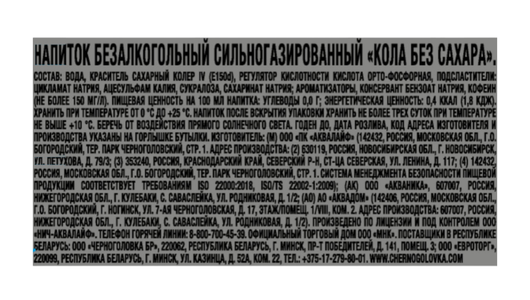 | Состав | вода, краситель сахарный колер iv (е150d), регулятор кислотности кислота орто-фосфорная, подсластители (цикламат натрия, ацесульфам калия, сукралоза, сахаринат натрия), ароматизаторы, консервант бензоат натрия, кофеин (не более 150 мг/л) |