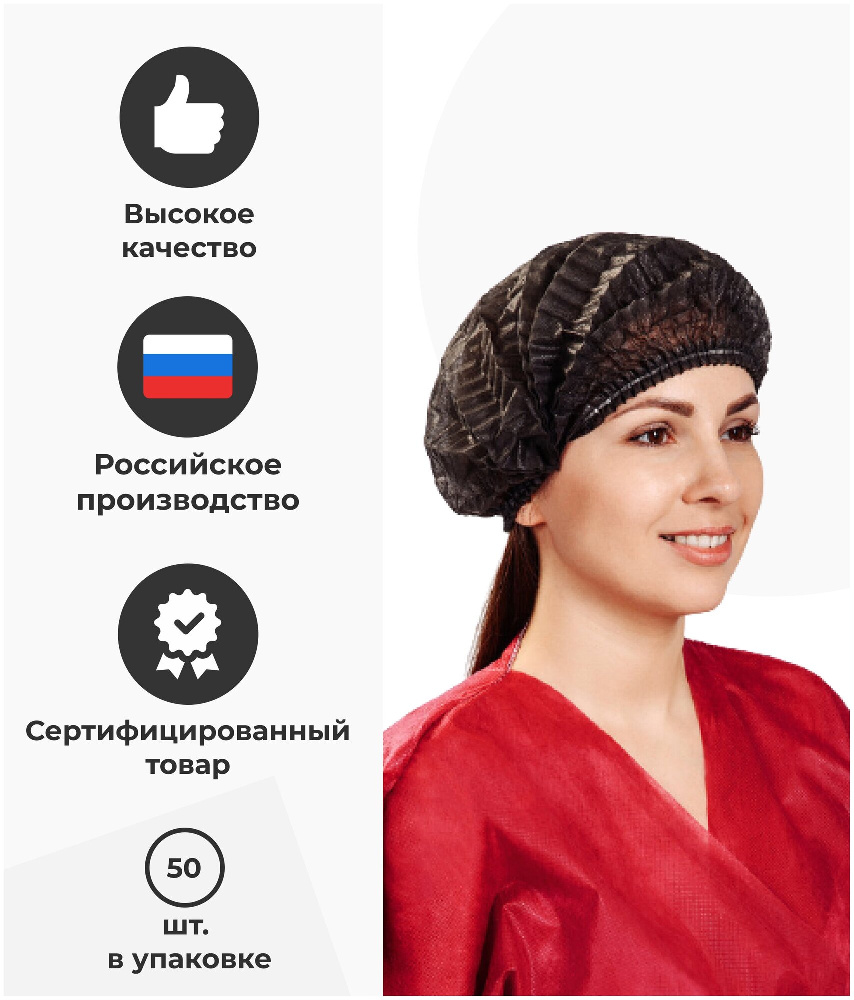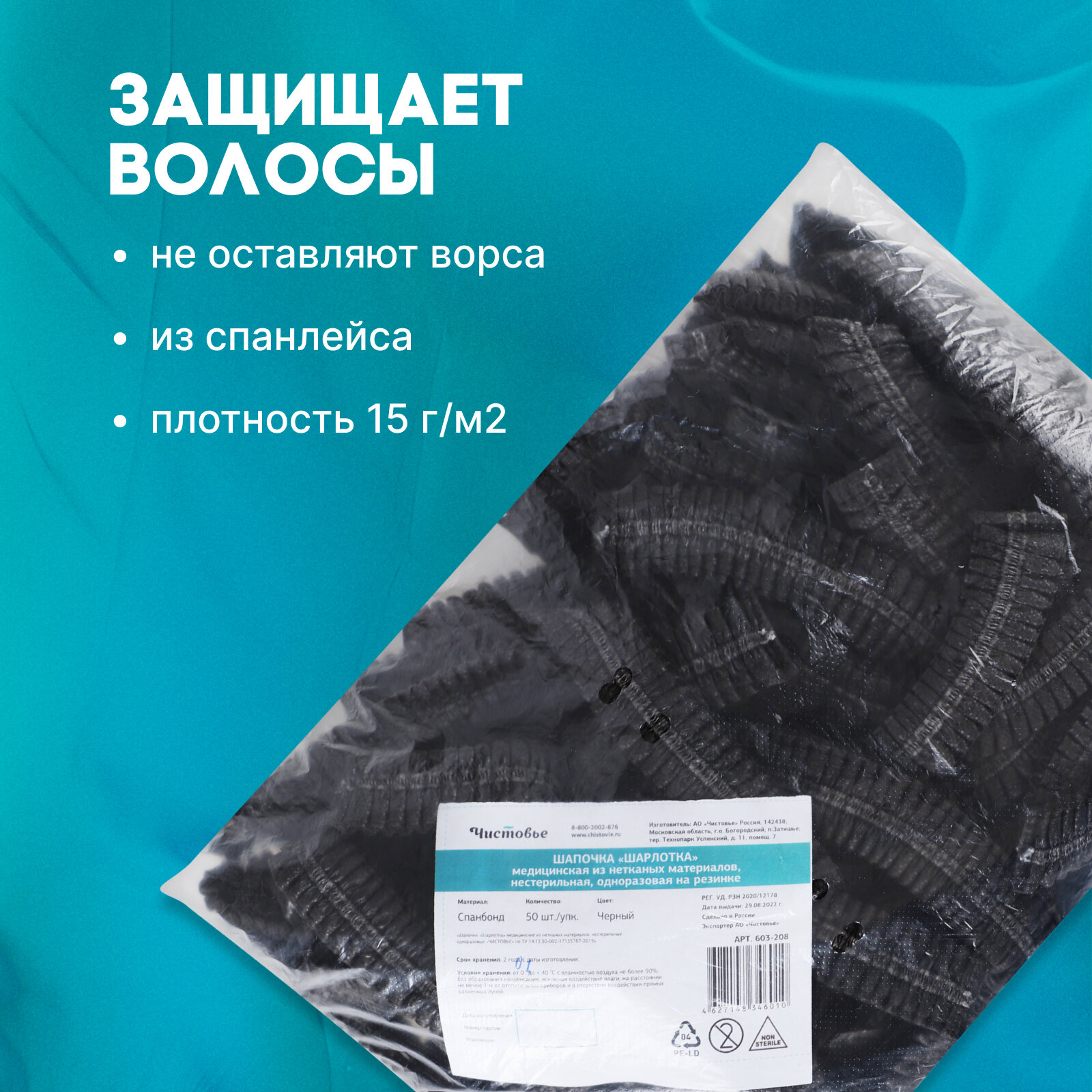 ЧИСТОВЬЕ Шапочка медицинская Шарлотка 10% спанбонд черный 50 шт (603-208)