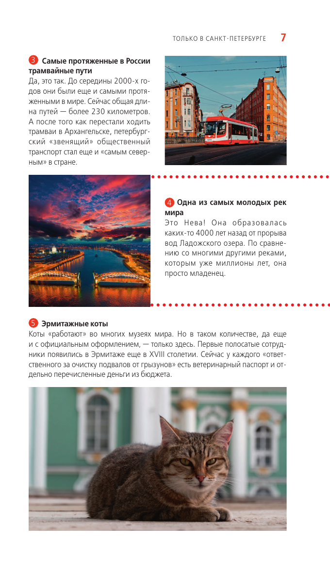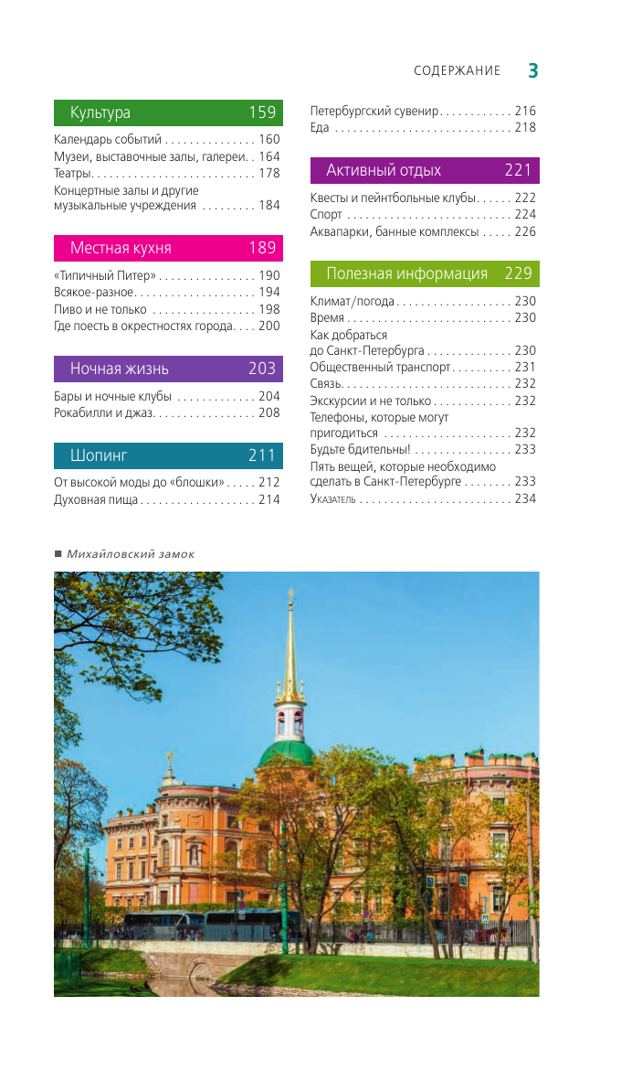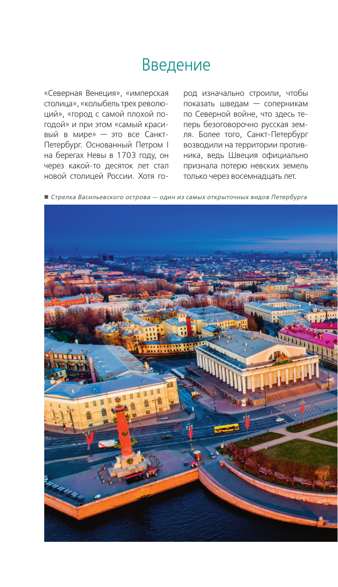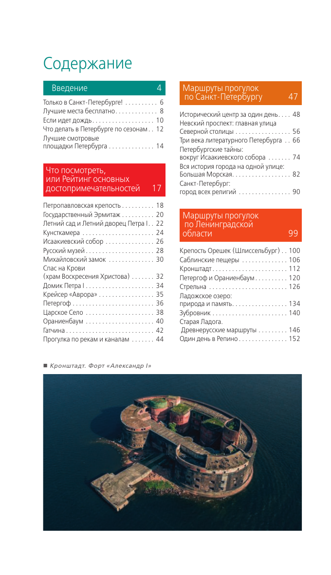 Помимо прогулок по городу, в путеводителе также собраны маршруты по окрестностям Санкт-Петербурга: Петергофу, Ораниенбауму, Стрельне, Кронштадту, парку «Зубровник», Старой Ладоге, Ладожскому озеру и крепости Орешек.