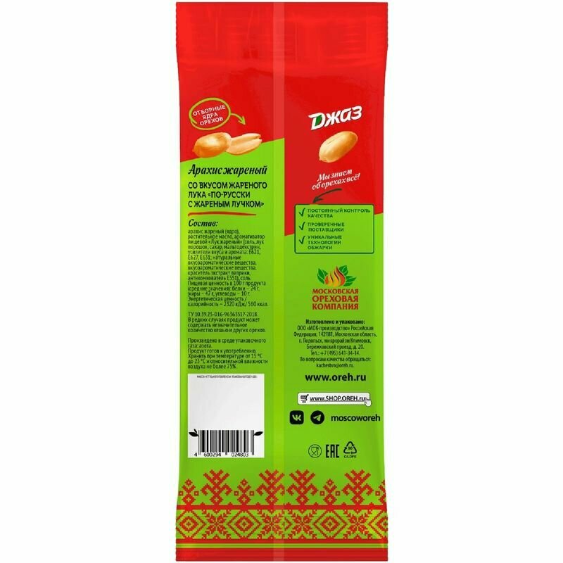 Арахис Джаз - это уникальный продукт на российском рынке. Цельный бразильский арахис сорта Раннер обжаривается с добавлением растительного масла. Для придания ему вкуса жареного лука используется высококачественная вкусоароматическая добавка с натуральными составляющими. Арахис Джаз отлично подойдет и для быстрого перекуса на ходу, и для вечерних посиделок у телевизора, и в качестве закуски к бокалу пива. Попробуйте, удовольствие гарантировано!