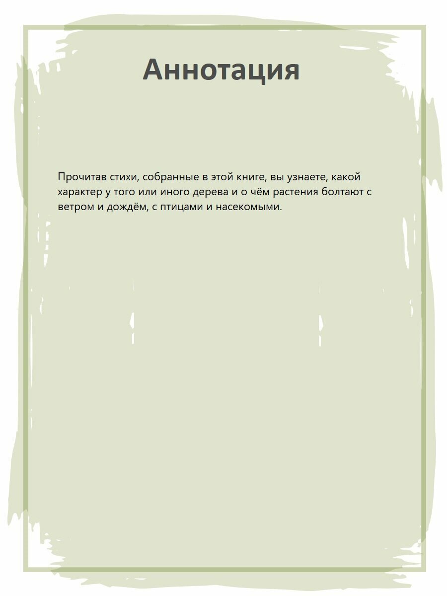 Ирина Петровна Токмакова - детский писатель, автор многих стихотворений, переводов, сказочных повестей. Прочитав стихи, собранные в этой книге, вы узнаете, какой характер у того или иного дерева и о чем растения болтают с ветром и дождем, с птицами и насекомыми. В них много сказочного, ведь рядом с самыми обычными вещами происходят чудеса: поют песенки дубовые сеянцы, ведут разговоры деревья, цветы, травы и насекомые, звери и птицы. Для младшего школьного возраста.