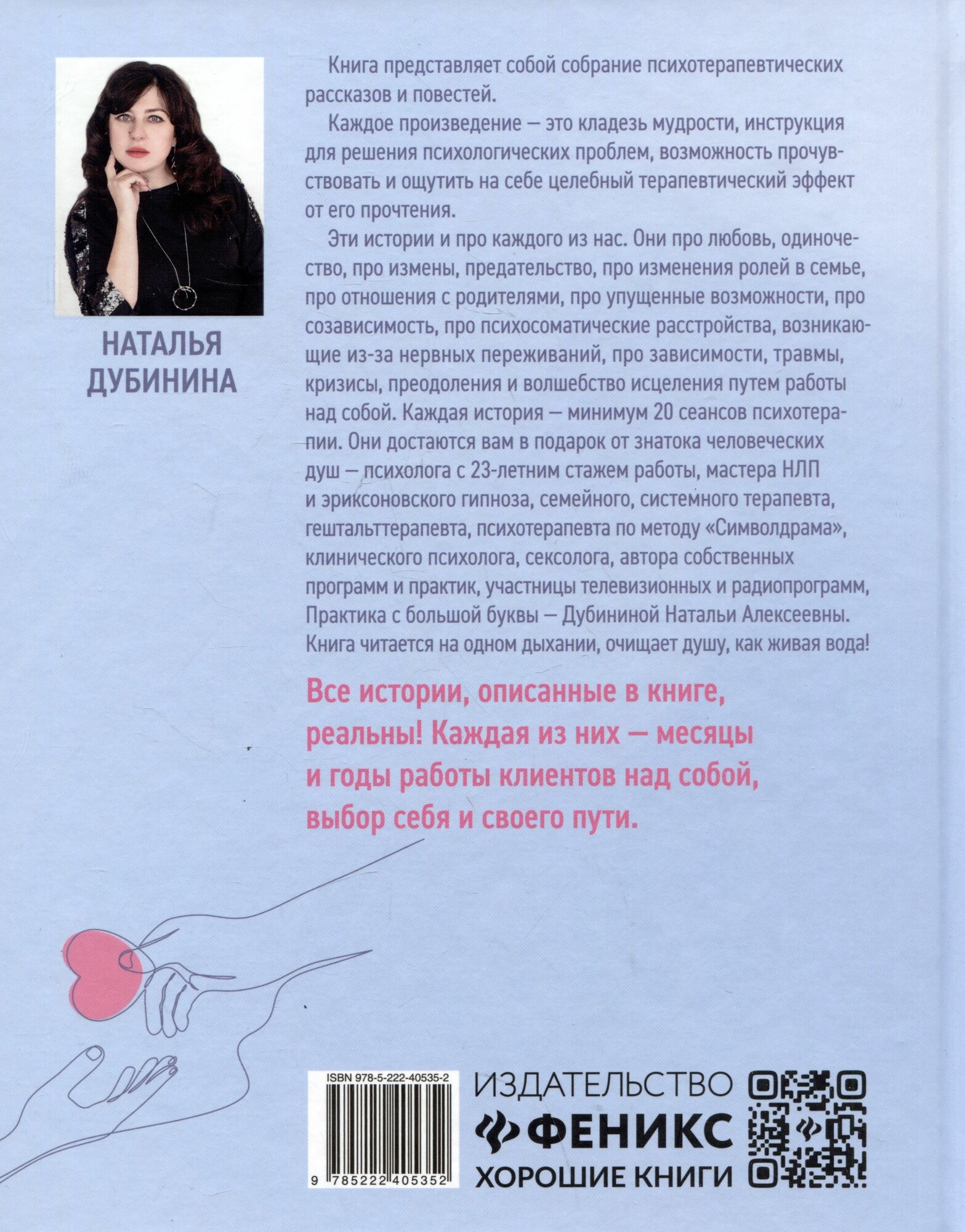 Книга представляет собой собрание психотерапевтических рассказов и повестей. Каждое произведение - это кладезь мудрости, инструкция для решения психологических проблем, возможность прочувствовать и ощутить на себе целебный терапевтический эффект от его прочтения. Все истории, описанные в книге, реальны! Каждая из них - месяцы и годы работы клиентов над собой, выбор себя и своего пути. Эти истории и про каждого из нас. Они про любовь, одиночество, про измены, предательство, про изменения ролей в семье, про отношения с родителями, про упущенные возможности, про независимость, про психосоматические расстройства, возникающие из-за нервных переживаний, про зависимости, травмы, кризисы, преодоления и волшебство исцеления путем работы над собой. Каждая история - минимум 20 сеансов психотерапии. Они достаются вам в подарок от знатока человеческих душ - психолога с 23-летним стажем работы, мастера НЛП и эриксоновского гипноза, семейного, системного терапевта, гештальттерапевта, психотерапевта по методу "Символдрама", клинического психолога, сексолога, автора собственных программ и практик, участницы телевизионных и радиопрограмм, Практика с большой буквы - Дубининой Натальи Алексеевны. Книга читается на одном дыхании, очищает душу, как живая вода!