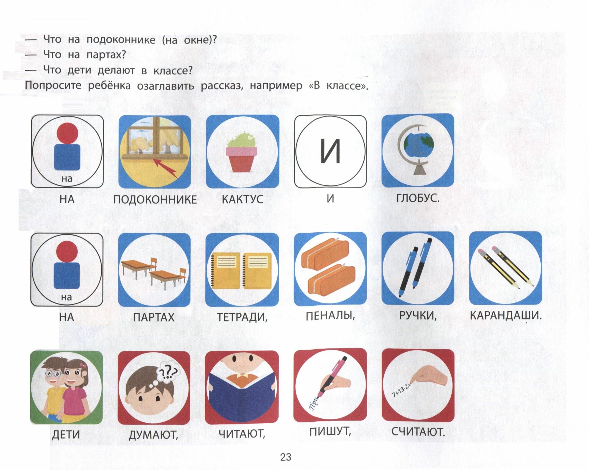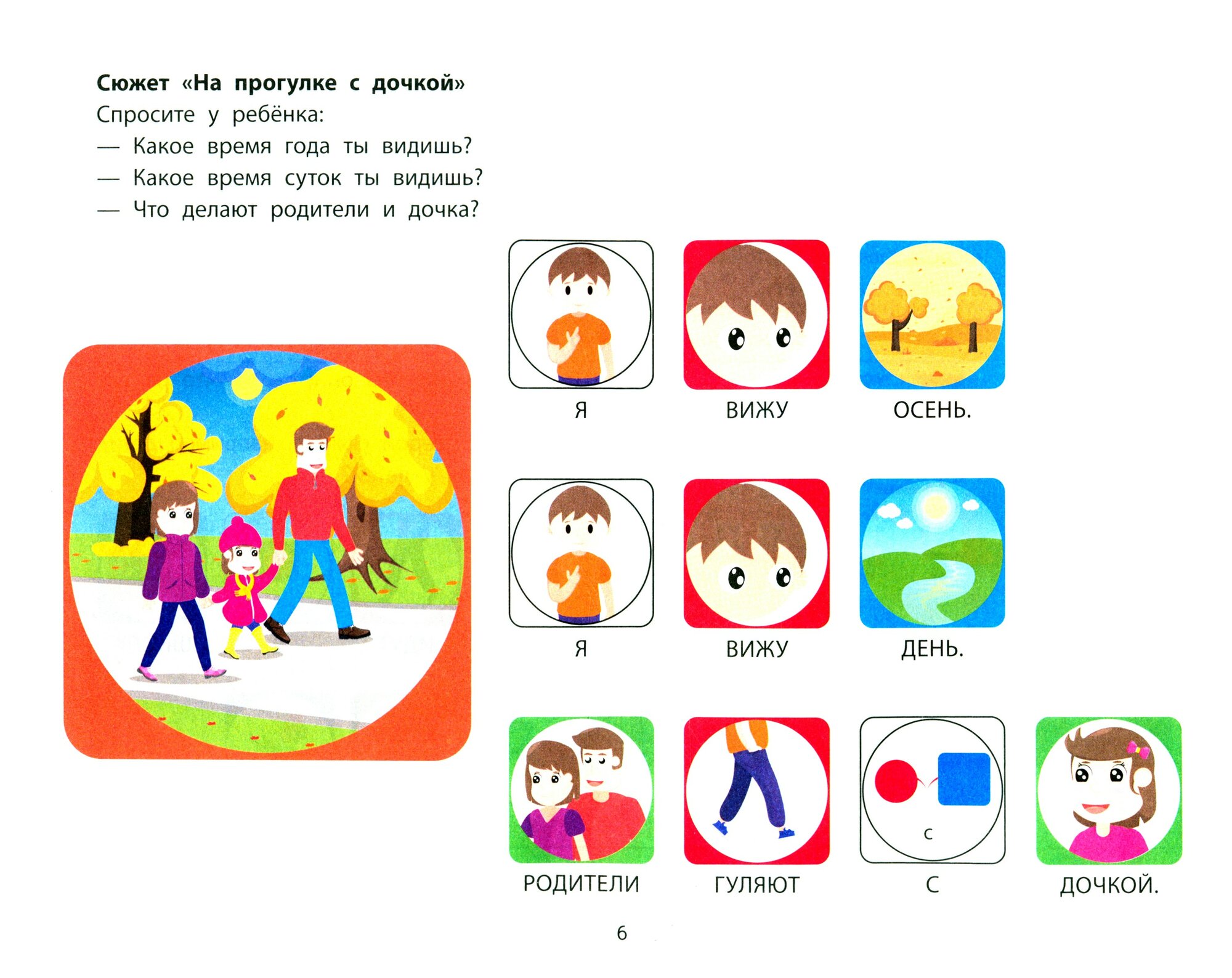 Это издание поможет ребенку конструировать предложения и составлять рассказы по сюжетным картинкам из данного альбома. Материал разработан для детей разного уровня языкового развития, в том числе и для тех, у которых есть сложности со спонтанной речью. К каждому сюжету прилагаются фразы для чтения. Ребенок с помощью наглядного моделирования предложения автоматизирует навык построения фраз, обогащая словарный запас и постигая азы чтения.