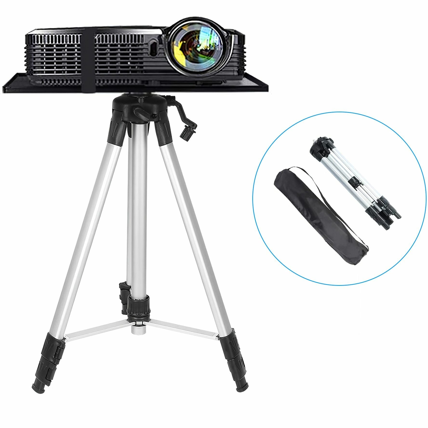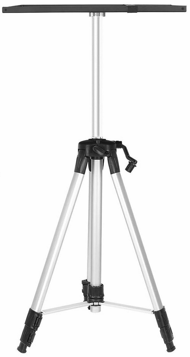 Штатив идеально подойдет для использования как больших, так и малых проекторов. Он имеет прочную алюминиевую конструкцию, которая обеспечивает стабильность и надежность при эксплуатации. Система телескопических ножек с фиксирующимися коленами позволяет регулировать высоту подставки в диапазоне от 50 до 140 см, что позволяет выбрать оптимальное положение для проектора.