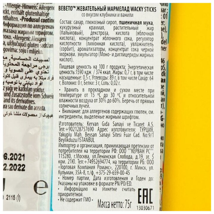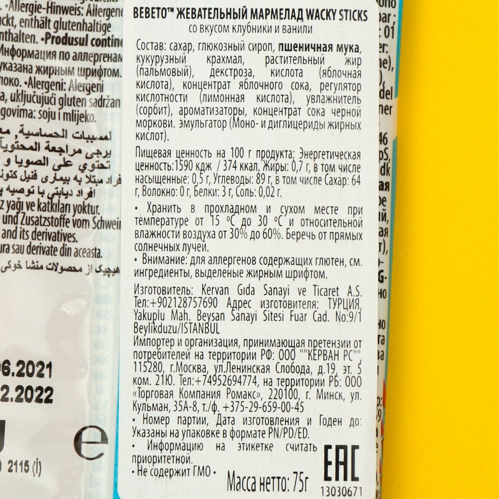 | Состав | сахар, глюкозный сироп, пшеничная мука, кукурузный крахмал, растительный жир (пальмовый), декстроза, кислота (яблочная кислота), концентрат яблочного сока, регулятор кислотности (лимонная кислота), увлажнитель (сорбит), ароматизаторы, концентрат сока черной моркови. эмульгатор (Моно- и диглицериды жирных кислот) |