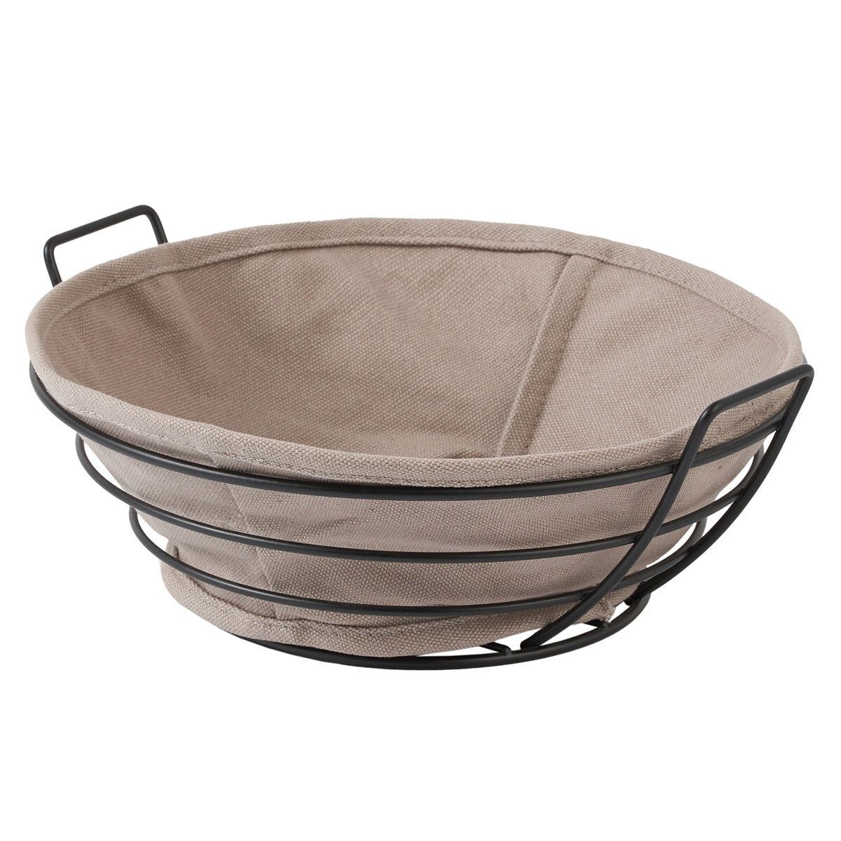 Стильная круглая корзинка для хлеба, покрытая эмалью черного цвета с текстильной вставкой серого цвета, идеально сочетается с современным дизайном кухни.