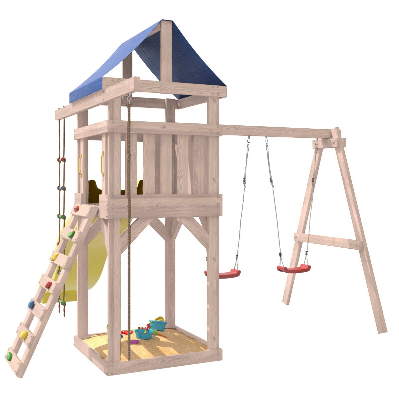 | Комплектация | Башня с тентом; Подвесные качели Лодочка (2шт); Веревочная лестница; Канат; Горка; Скалодром; Песочница под башне |