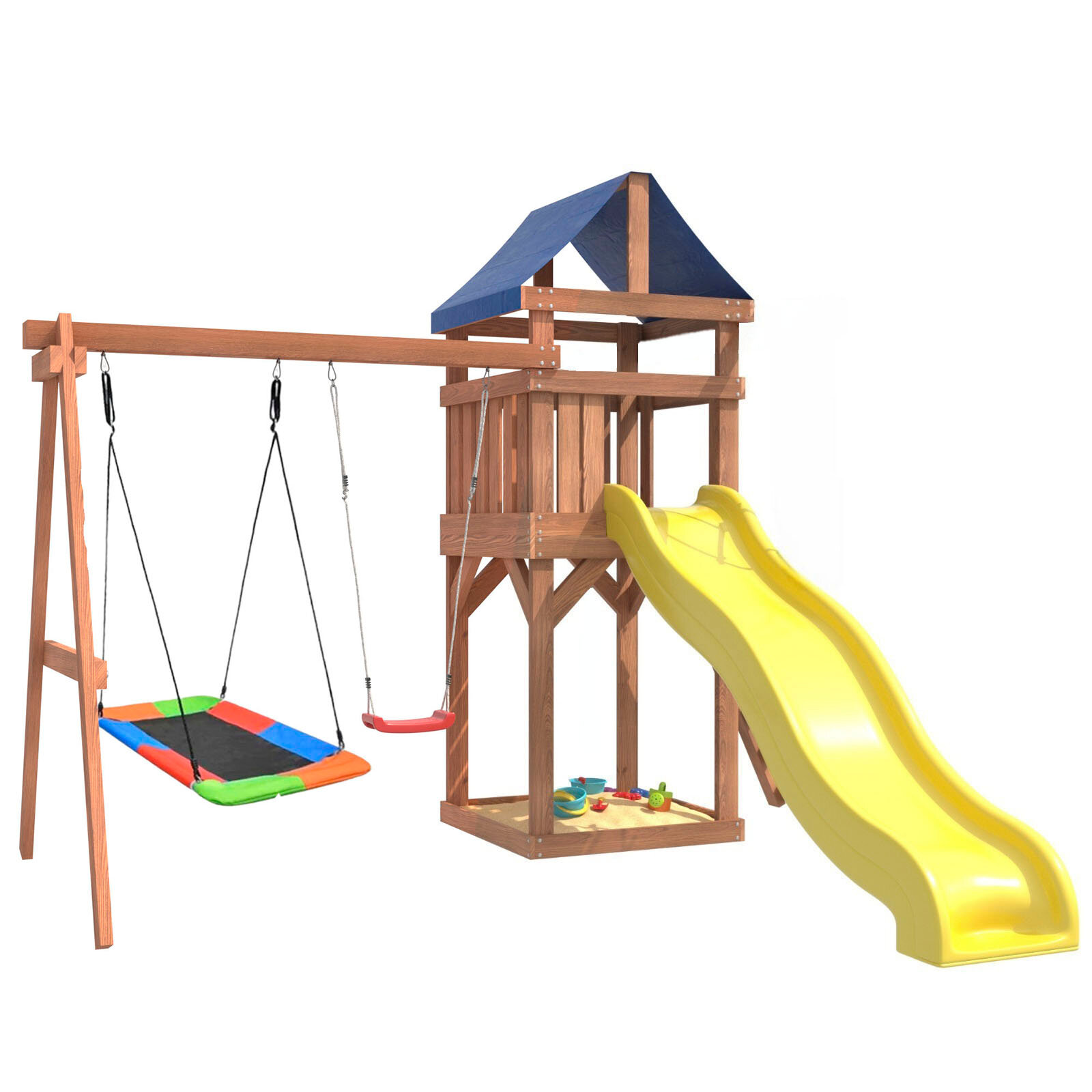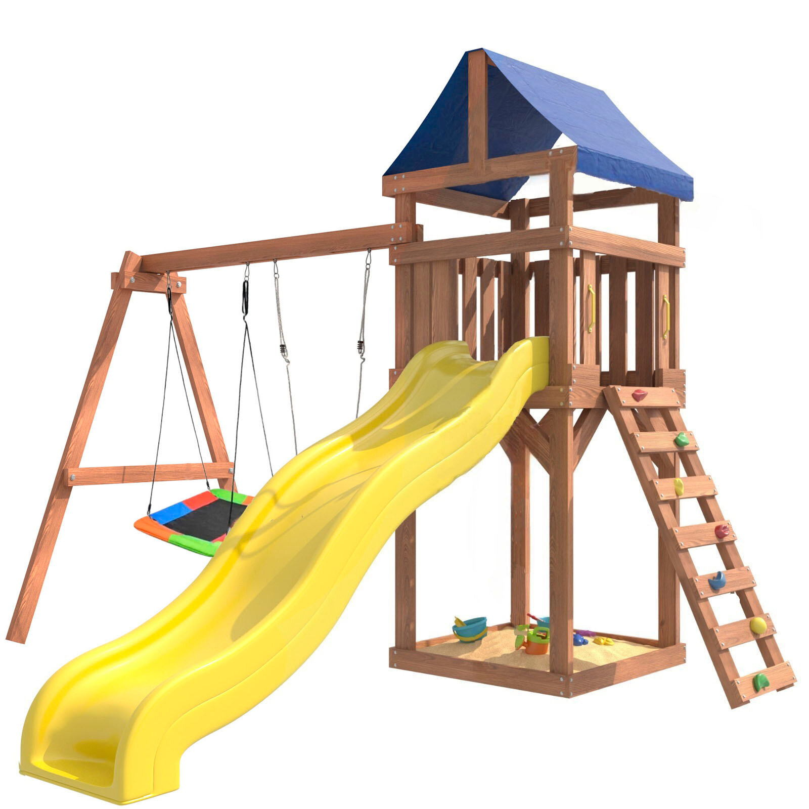| Комплектация | Башня с тентом; Подвесные качели Лодочка и прямоугольное гнездо Лодка; Горка; Скалодром; Песочница под башне |