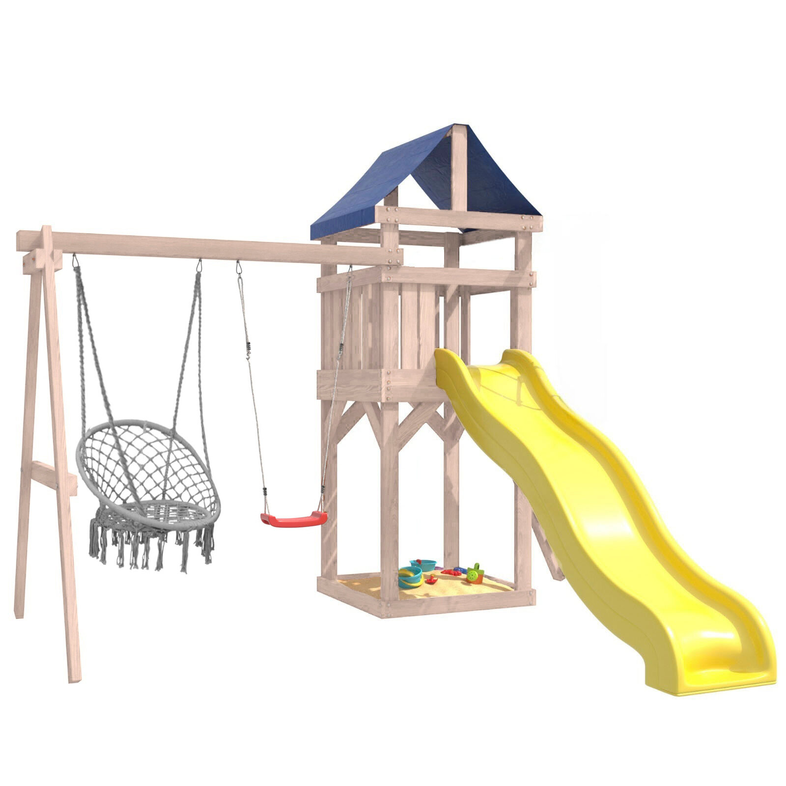 | Комплектация | Башня с тентом; Подвесные качели лодочка и подвесное плетеное кресло; Горка; Скалодром; Песочница под башней |