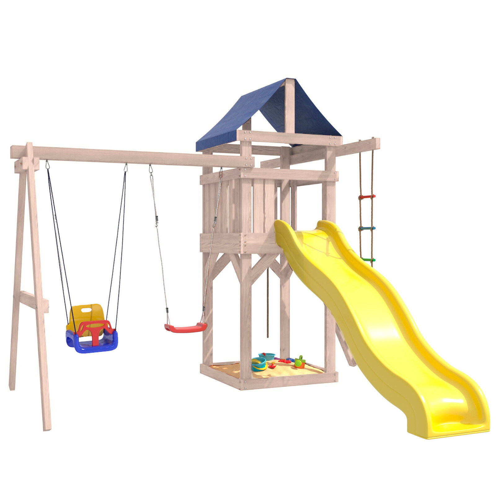 | Комплектация | Башня с тентом; Подвесные качели Лодочка и качели 3 в 1; Веревочная лестница; Канат; Горка; Скалодром; Песочница под башне |