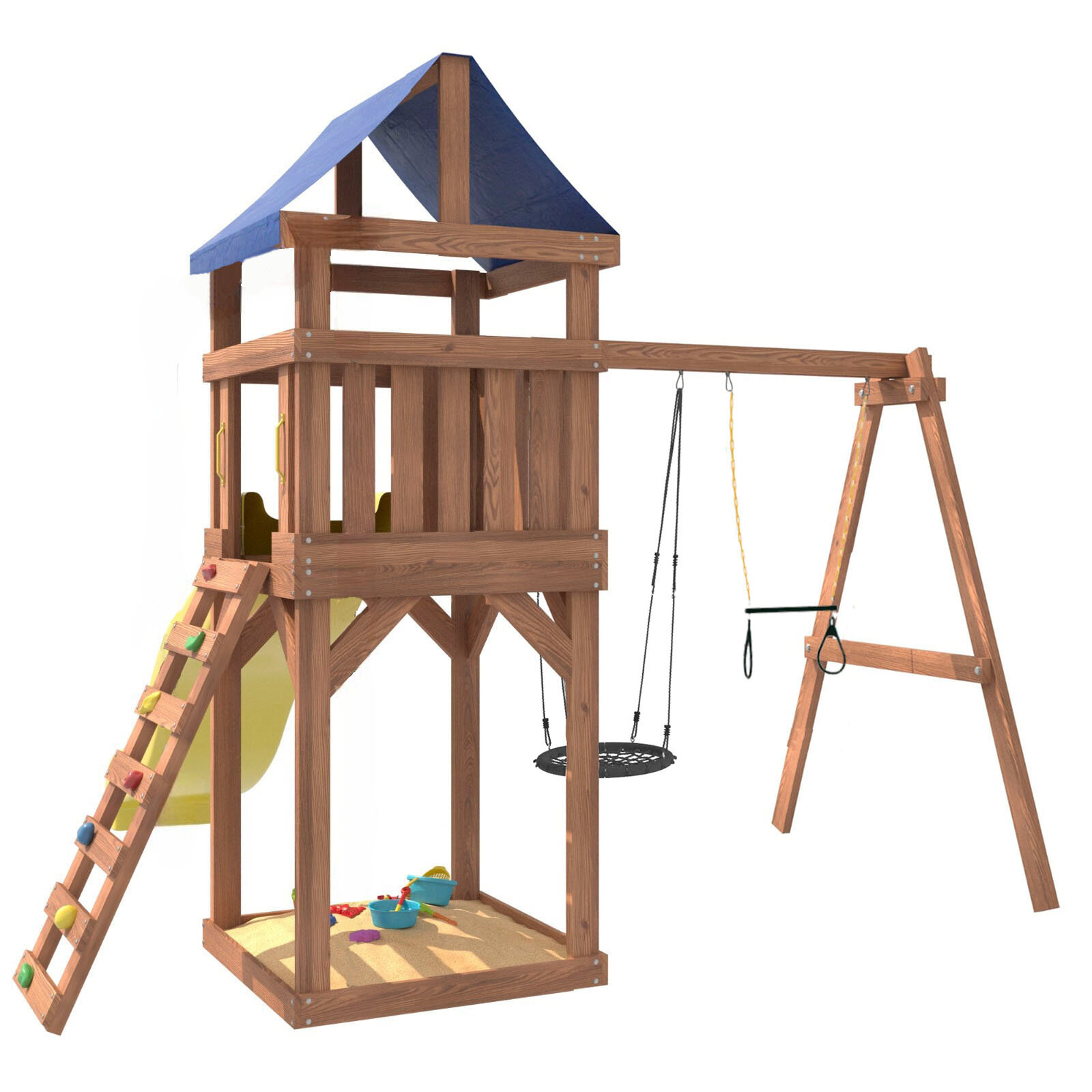 | Комплектация | Башня с тентом; Подвесные качели гнездо 60 см; Трапеция; Горка; Скалодром; Песочница под башне |