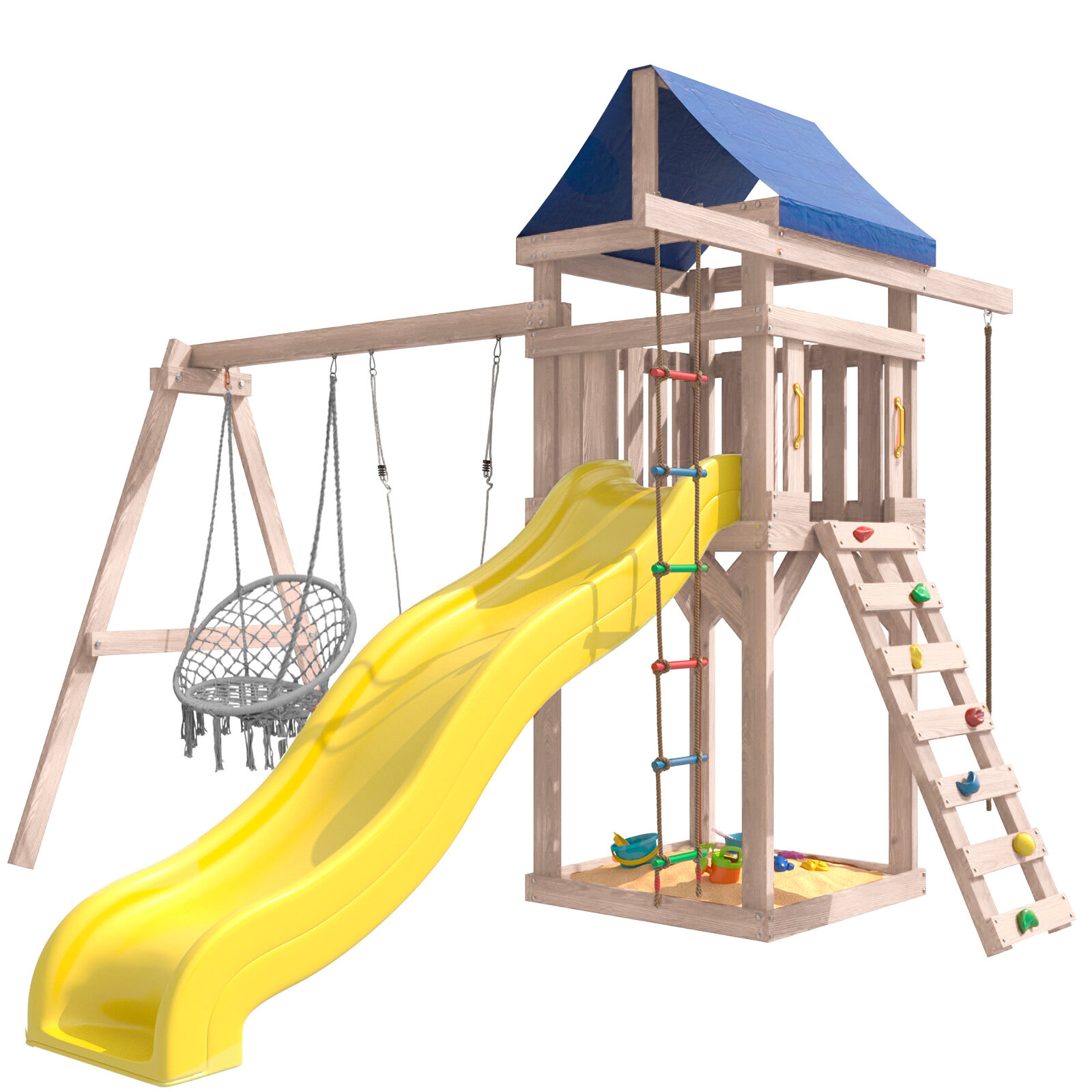 | Комплектация | Башня с тентом; Подвесные качели лодочка и подвесное плетеное кресло; Веревочная лестница; Канат; Горка; Скалодром; Песочница под башне |