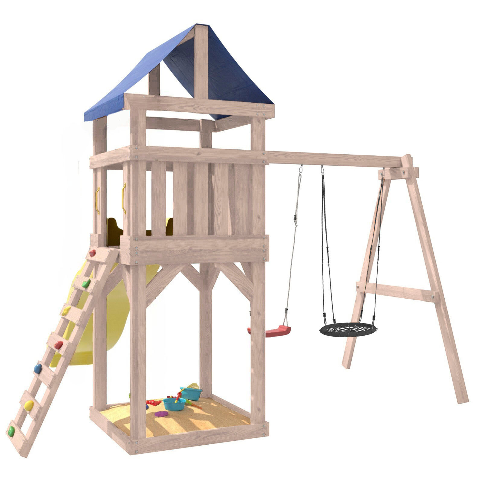 | Комплектация | Башня с тентом; Подвесные качели Лодочка и гнездо 60 см; Горка; Скалодром; Песочница под башней |