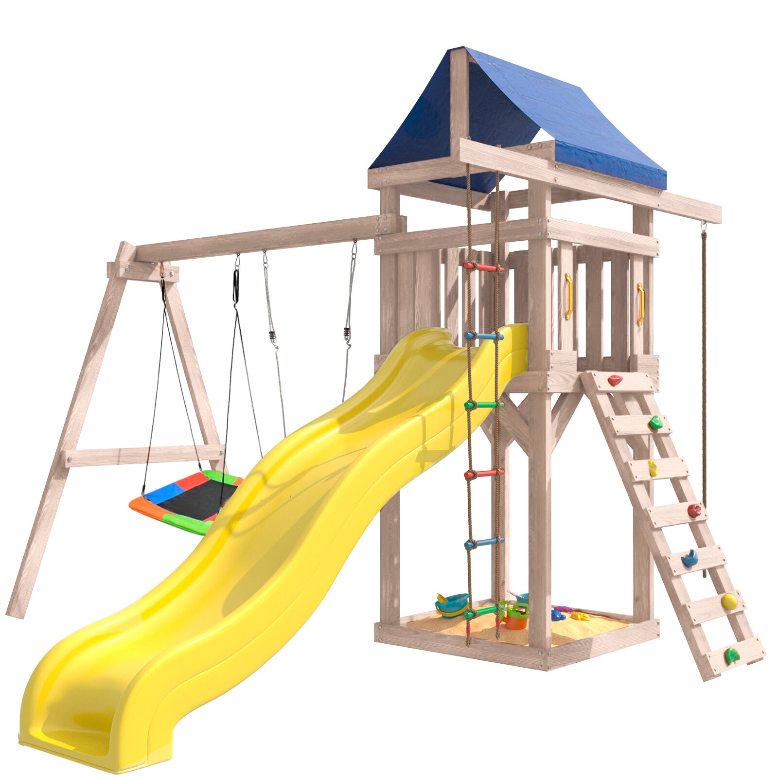 | Комплектация | Башня с тентом; Подвесные качели Лодочка и прямоугольное гнездо Лодка; Веревочная лестница; Канат; Горка; Скалодром; Песочница под башне |