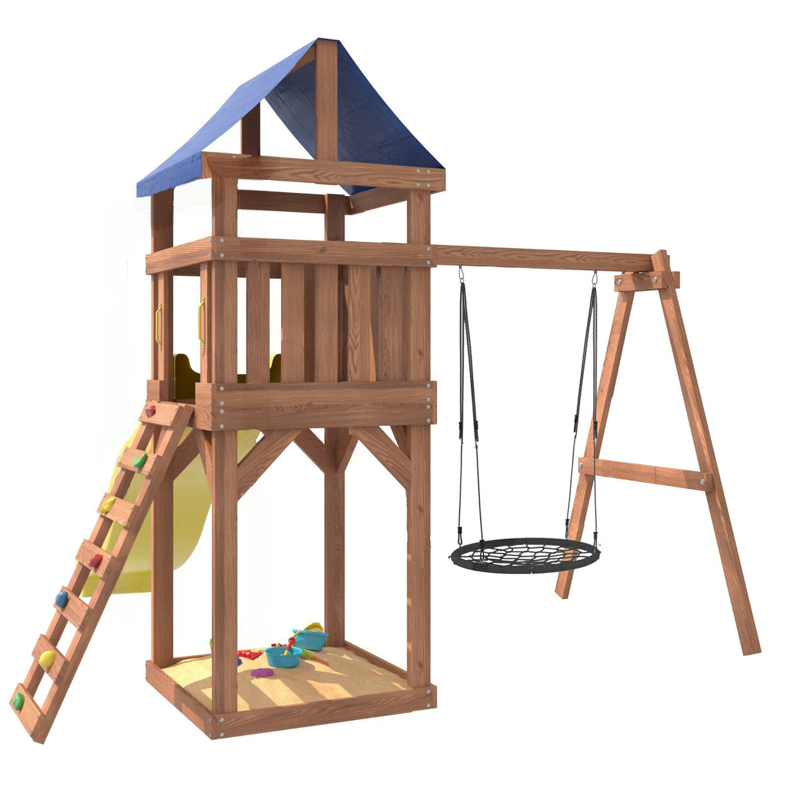 | Комплектация | Башня с тентом; Подвесные качели гнездо 100 см; Горка; Скалодром; Песочница под башне |