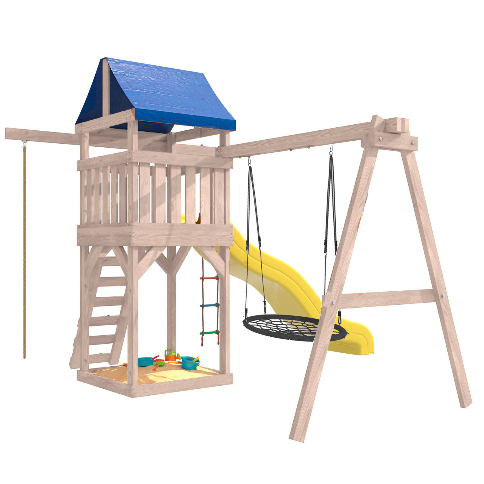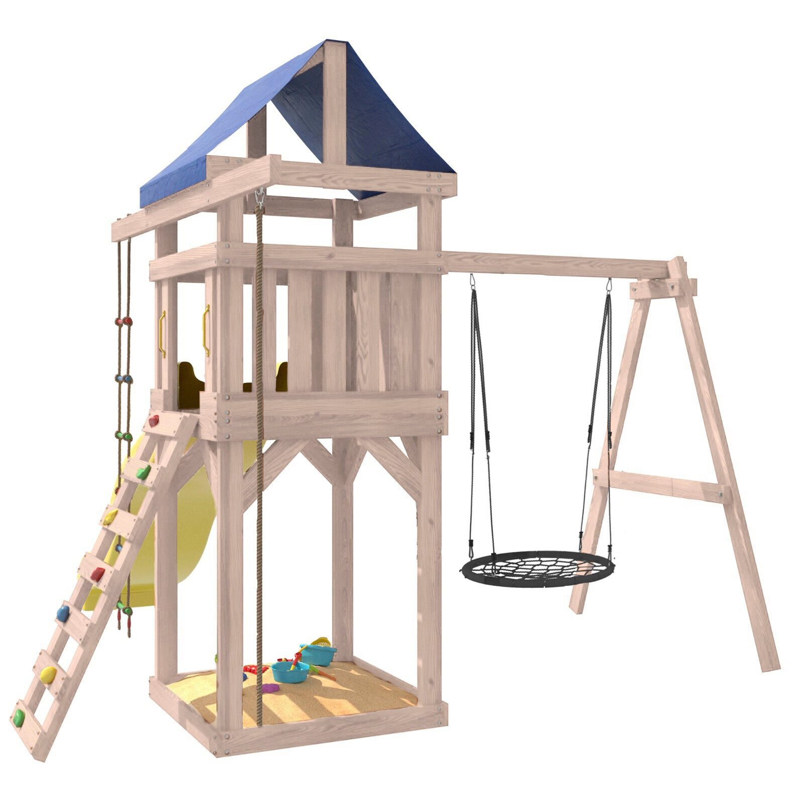 | Комплектация | Башня с тентом; Подвесные качели гнездо 100 см; Веревочная лестница; Канат; Горка; Скалодром; Песочница под башней |