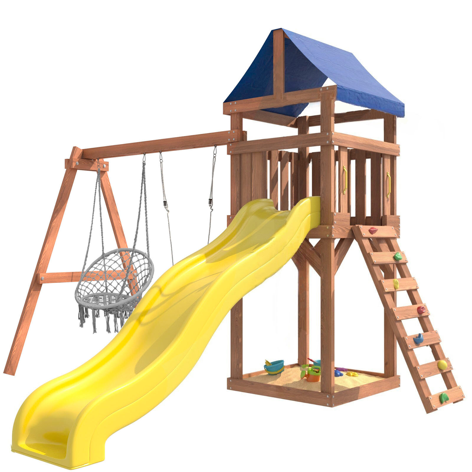 | Комплектация | Башня с тентом; Подвесные качели лодочка и подвесное плетеное кресло; Горка; Скалодром; Песочница под башне |