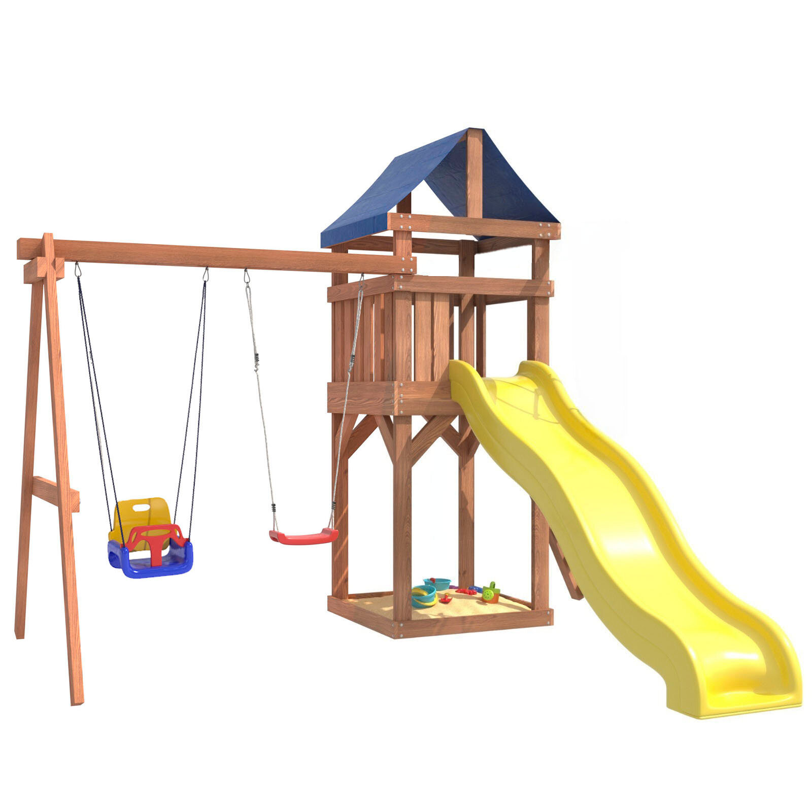| Комплектация | Башня с тентом; Подвесные качели Лодочка и качели 3 в 1; Горка; Скалодром; Песочница под башне |