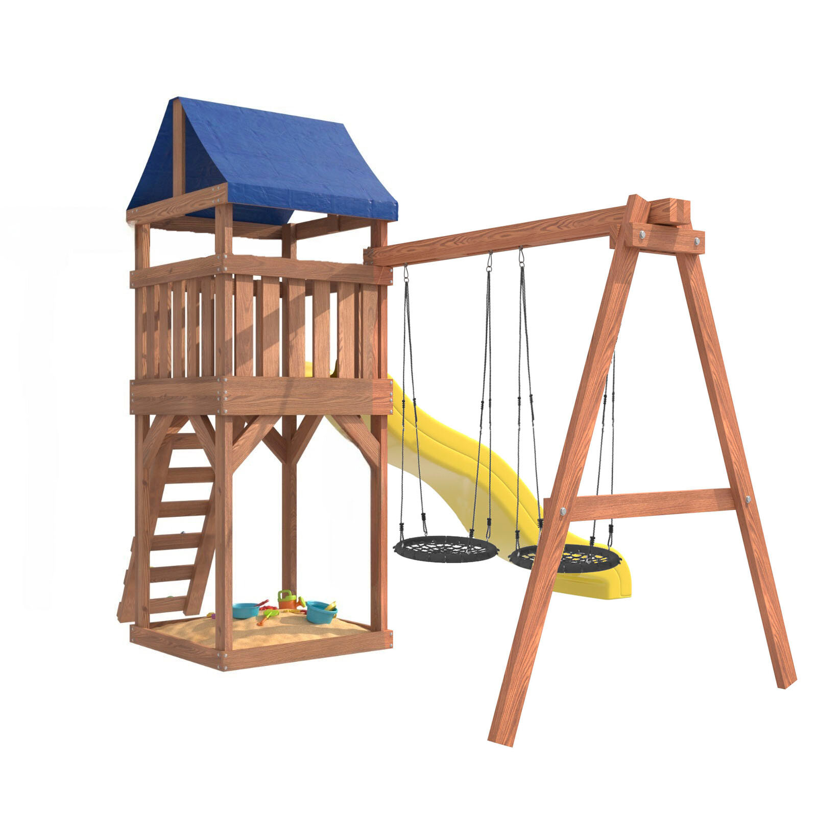 | Комплектация | Башня с тентом; Подвесные качели гнездо 60 см (2шт); Горка; Скалодром; Песочница под башне |