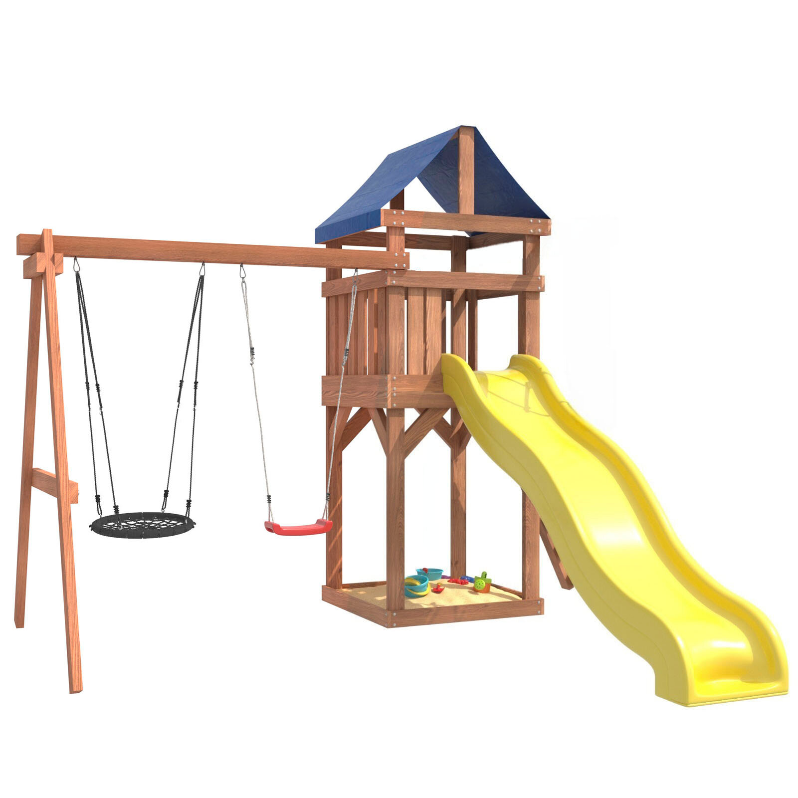 | Комплектация | Башня с тентом; Подвесные качели Лодочка и гнездо 60 см; Горка; Скалодром; Песочница под башне |