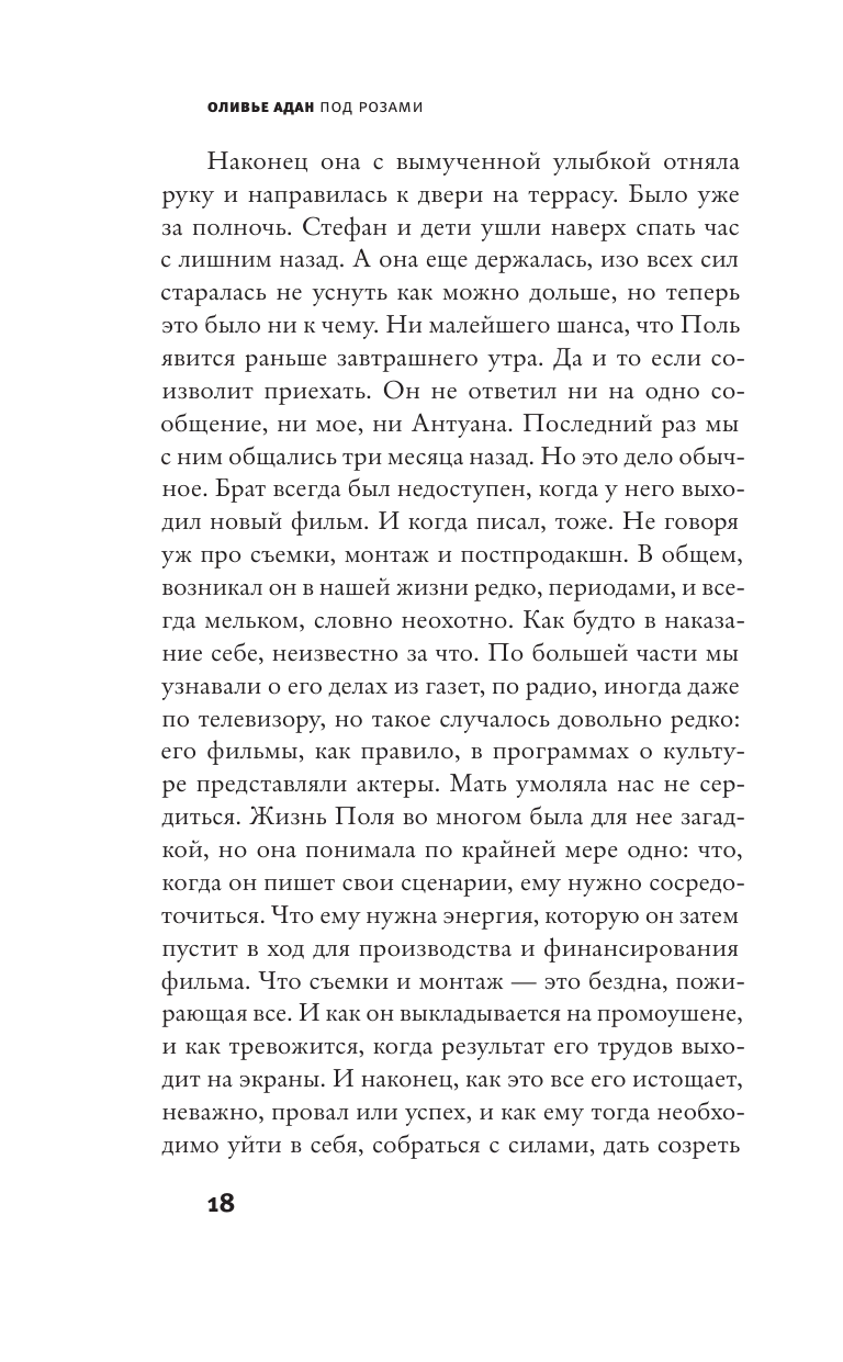 Преуспевающий топ-менеджер Антуан, медсестра Клер и успешный кинорежиссер Поль, порвавший отношения с родней много лет назад, съезжаются в дом своего детства на похороны отца. Три дня в родительском доме — три акта семейной драмы. Встреча сопровождается бурными объяснениями. Все трое по очереди ведут рассказ от первого лица, вспоминают — по разному — общее прошлое, перекидываются цитатами и мемами из любимых фильмов и песен, ссорятся, мирятся, признаются в давних грехах. Поль попадает под перекрестный огонь упреков: он черпает сюжеты своих фильмов в истории семьи, нанося глубокие раны близким. В стычках выплескиваются затаенные обиды, жизнь и любовь каждого подвергаются пересмотру.Оливье Адан — популярный романист, сценарист и драматург, лауреат престижных премий, в том числе Гонкуровской за новеллу. Многие его книги экранизированы. “Под розами” — первая публикация знаменитого французского автора на русском языке.