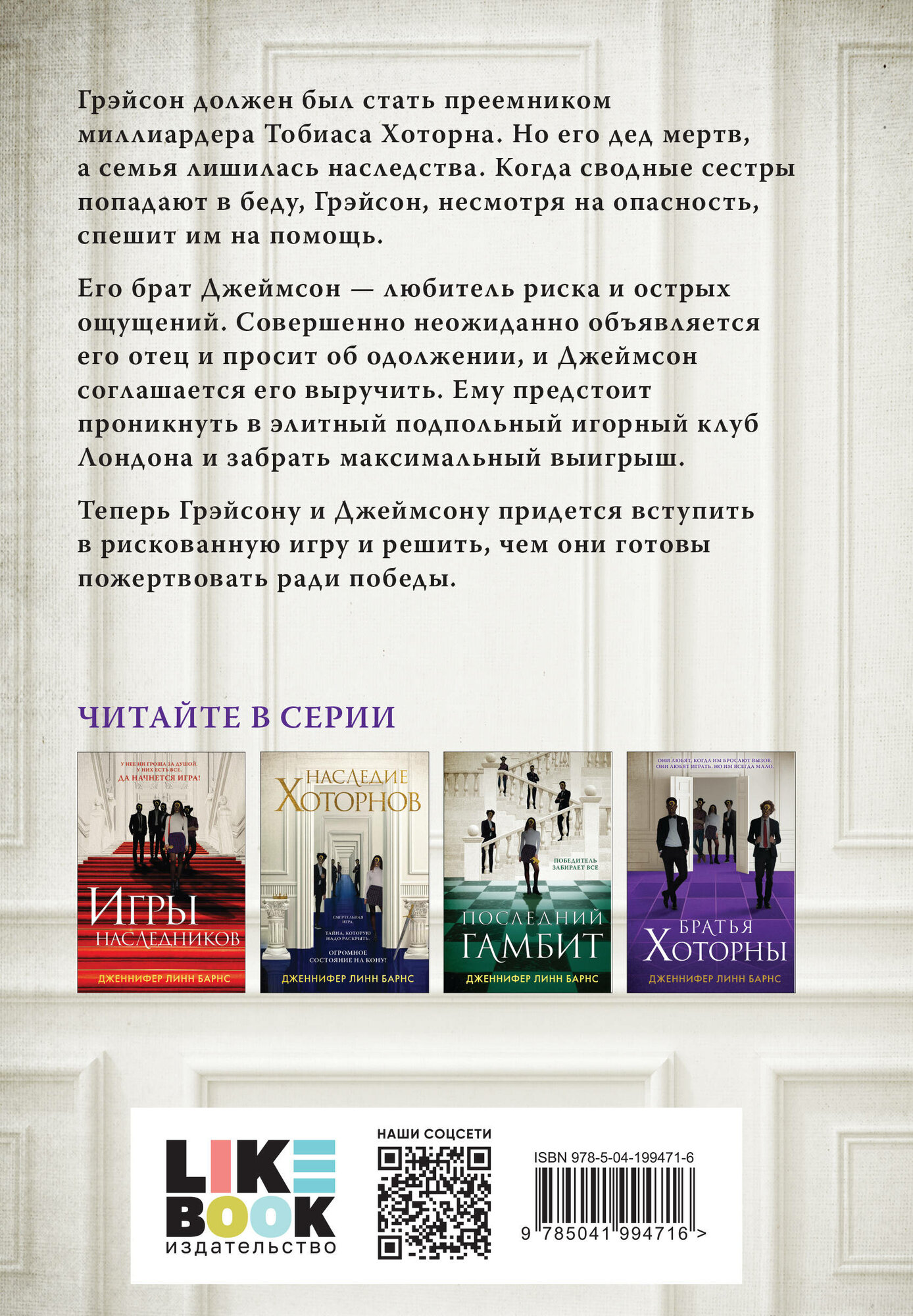 Продолжение мирового бестселлера «Игры наследников». Грейсон должен был стать приемником миллиардера Тобиаса Хоторна. Но его дед мертв, а семья лишилась наследства. Когда сводные сестры попадают в беду, Грейсон, несмотря на опасность, спешит им на помощь. Его брат Джеймсон — любитель риска и острых ощущений. Совершенно неожиданно объявляется его отец и просит об одолжении, и Джеймсон соглашается его выручить. Ему предстоит проникнуть в элитный подпольный игорный клуб Лондона и забрать максимальный выигрыш. Теперь Грейсону и Джеймсону придется вступить в рискованную игру и решить, чем они готовы пожертвовать ради победы.