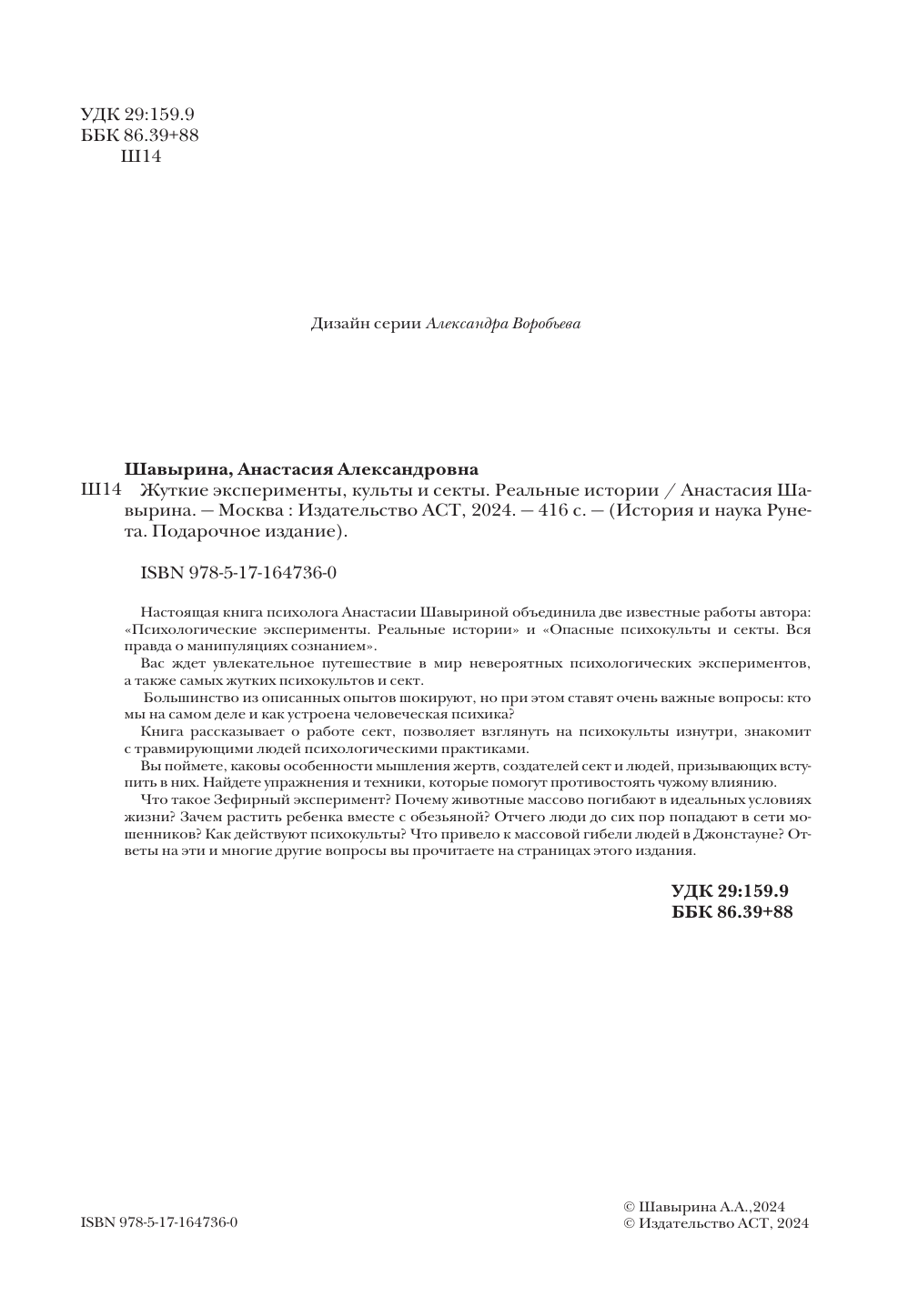 Настоящая книга психолога Анастасии Шавыриной объединила две известные работы автора: «Психологические эксперименты. Реальные истории» и «Опасные психокульты и секты. Вся правда о манипуляциях сознанием».Вас ждет увлекательное путешествие в мир невероятных психологических экспериментов, а также самых жутких психокультов и сект. Большинство из описанных опытов шокируют, но при этом ставят очень важные вопросы: кто мы на самом деле и как устроена человеческая психика? Книга рассказывает о работе сект, позволяет взглянуть на психокульты изнутри, знакомит с травмирующими людей психологическими практиками.Вы поймете, каковы особенности мышления жертв, создателей сект и людей, призывающих вступить в них. Найдете упражнения и техники, которые помогут противостоять чужому влиянию. Что такое Зефирный эксперимент? Почему животные массово погибают в идеальных условиях жизни? Зачем растить ребенка вместе с обезьяной? Отчего люди до сих пор попадают в сети мошенников? Как действуют психокульты? Что привело к массовой гибели людей в Джонстауне? Ответы на эти и многие другие вопросы вы прочитаете на страницах этого издания.