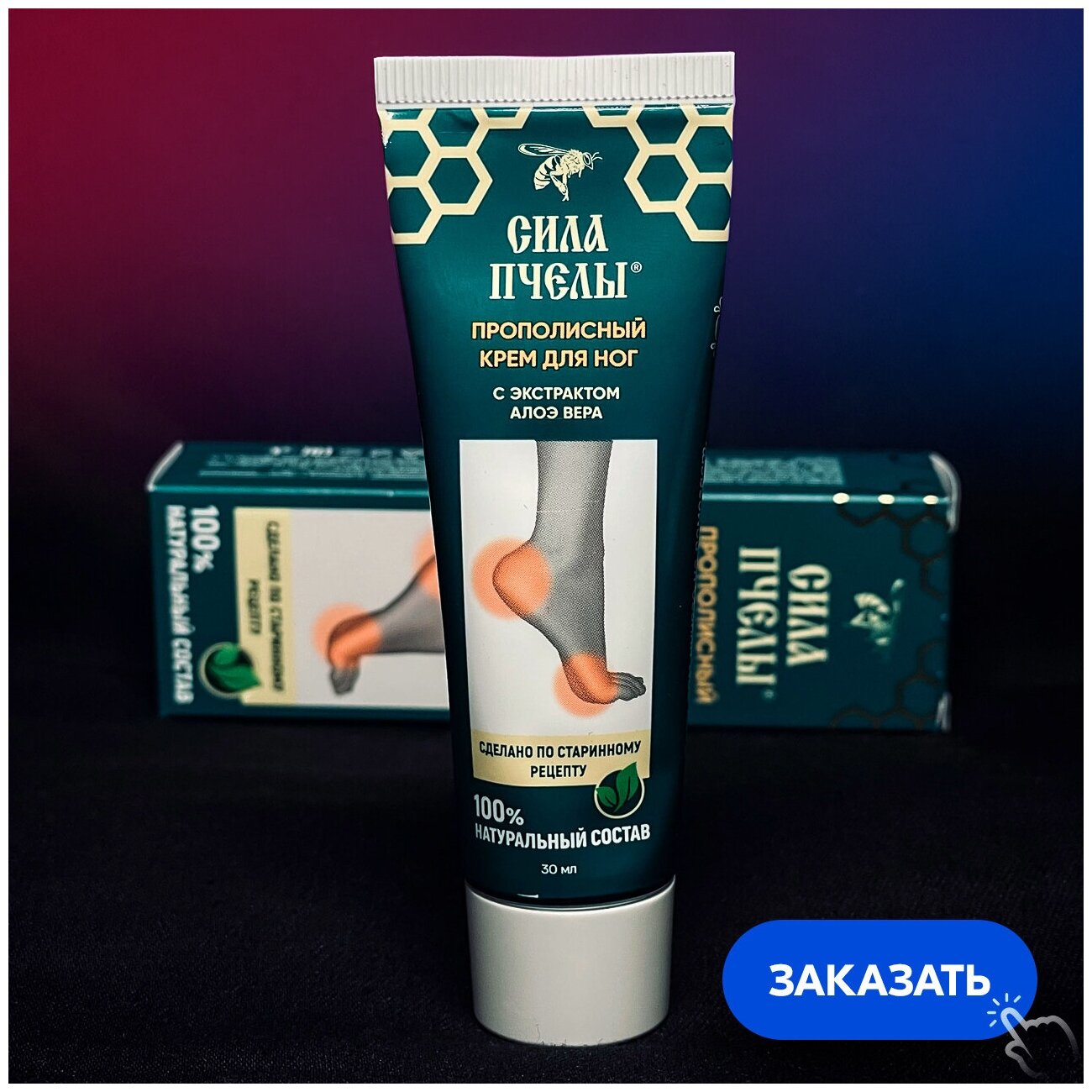Мазь от грибка на ногах, ногтей, сухости, жжения, трещин, увлажняющий, восстанавливающий с экстрактом алоэ вера сила пчелы. Натуральные компоненты крема обеспечивают эффективный уход за кожей ног и ступней. Мазь от грибка сила пчелы: стимулирует регенерации мелких трещин и ранок на коже, восстанавливает кожный покров, обладает антисептическими свойствами, избавляет от чрезмерной сухости и шелушения. Средство от грибка предназначено для наружного применения, оказывает комплексное воздействие, повышает эластичность кожных покровов, насыщает питательными веществами, а также способствует восстановлению кожных покровов при повреждении.Крем прекрасно подходит для интенсивного смягчения кожи стоп,а также, как дополнительное средство, при профилактике грибковых инфекций стоп и ногтей. Устраняет зуд и раздражение с пораженных участков, снимает воспаление. Обладает выраженными увлажняющими свойствами: применим как для очень сухой и обезвоженной, так и для нормальной кожи. Крем оказывает положительное влияние на микрофлору кожи ступней. Пользоваться кремом от грибека сила пчелы удобно: удобное дозирование препарата из тюбика, легкая, прочная, стильная упаковка в тюбике, легко поместится в сумочку в дальних поездках, полностью натуральный состав на основе природных компонентах, мазь обладает приятным запахом, срок годности после вскрытия 6 месяцев - используйте мазь только тогда, когда вам это необходимо Крем для ног и стоп рекомендуется применять для ежедневного увлажнения или экстренного восстановления кожи.Наносить крем 2 раза в день (утром и вечером) легкими массажными движениями. Для эффективного избавления от грибка ног, ногтей, зуда, трещин, высыпаний между пальцами ног, трещин на ступнях, шершавой кожи, язв на верхней стороне стопы заказывайте мазь для ног сила пчелы!