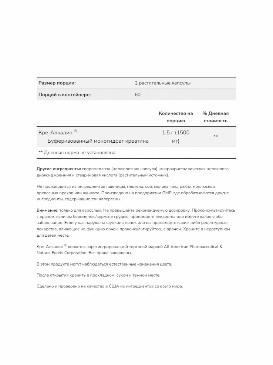 | Состав | Креатин моногидрат (KRE-ALKALYN), гидроксипропилметилцеллюлоза (капсула), микрокристаллическая целлюлоза (носитель), диоксид кремния (антислеживающий агент), стеариновая кислота. |