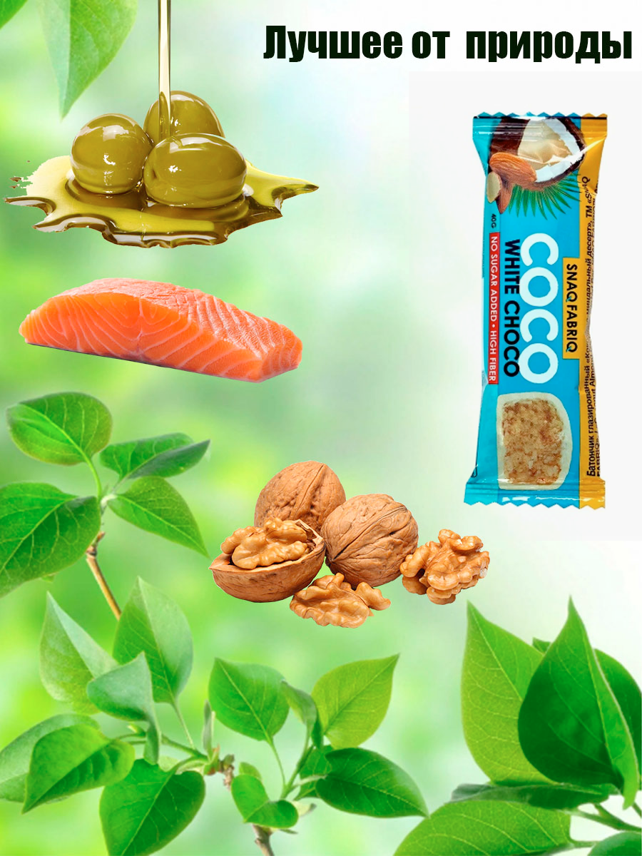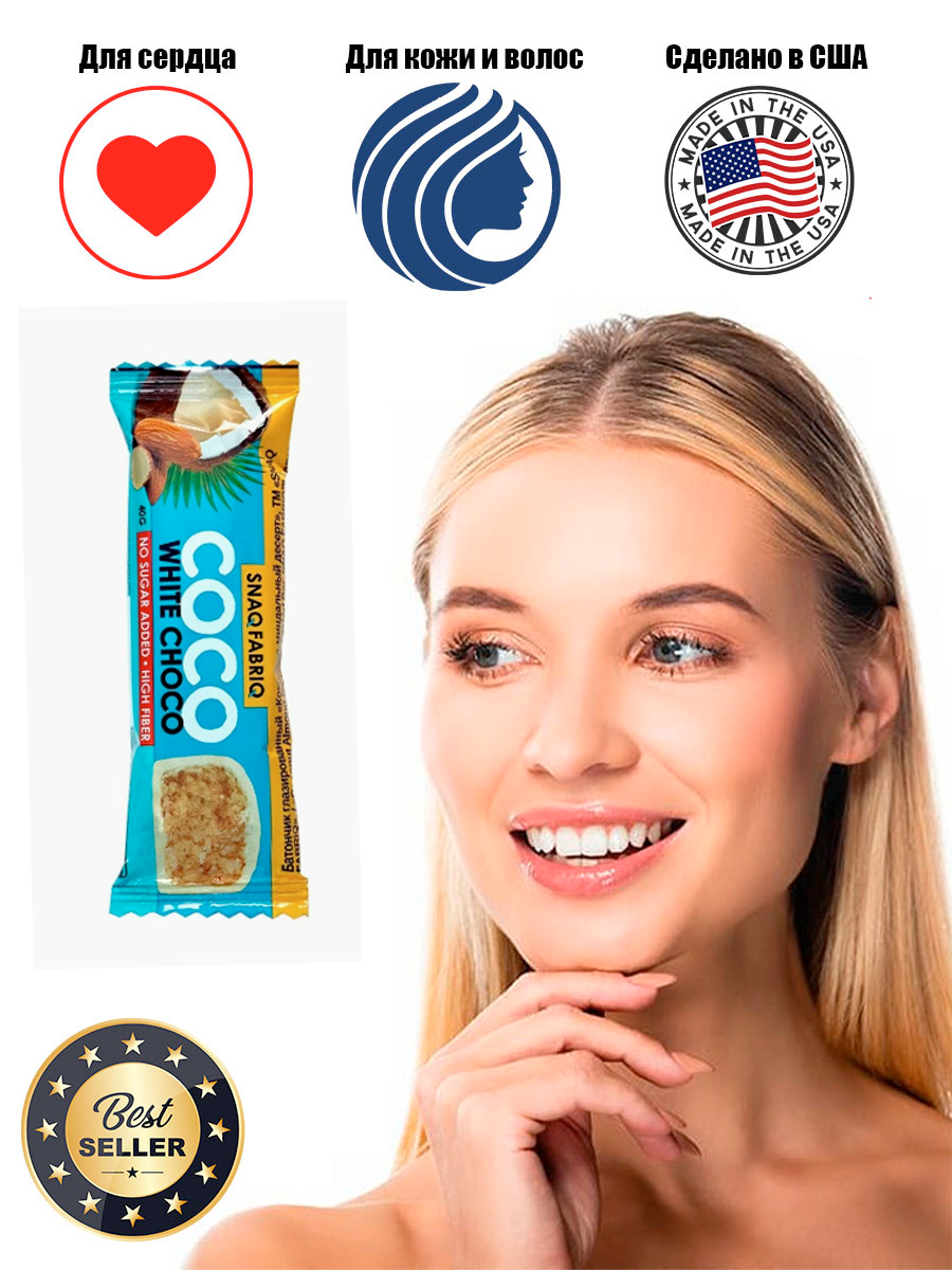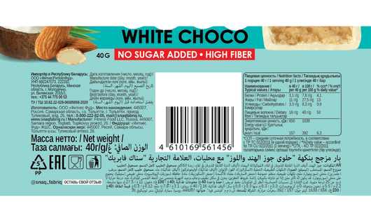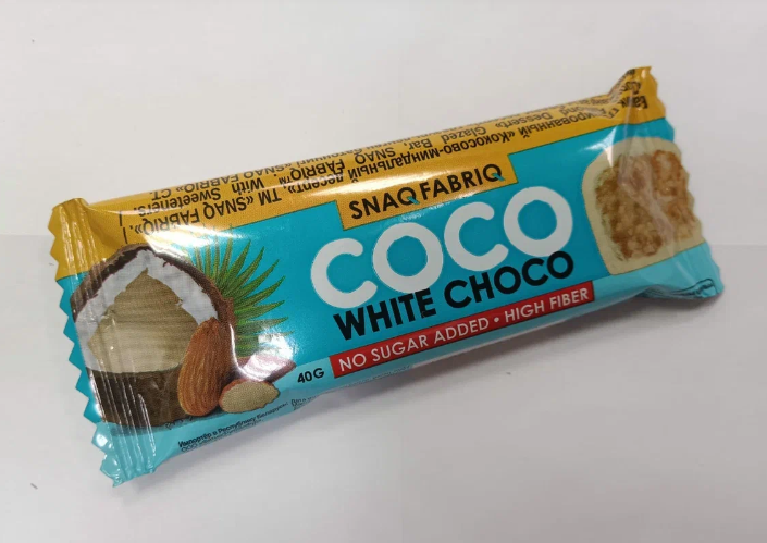 | Состав | Кокос, водорастворимые волокна кукурузы, белый шоколад (водорастворимые волокна кукурузы, какао масло, молоко сухое цельное, молоко сухое обезжиренное, эмульгатор (соевый лецитин), ароматизаторы натуральные, подсластитель (сукралоза)), миндаль, инулин (пищевые волокна), олигофруктоза (пищевые волокна), вода, молоко сухое цельное, агент влагоудерживающий (глицерин), подсластитель (сорбит), соль, ароматизаторы натуральные, регулятор кислотности (лимонная кислота), антиокислитель (аскорбиновая кислота), консервант (сорбат калия), натуральный подсластитель (стевия). |