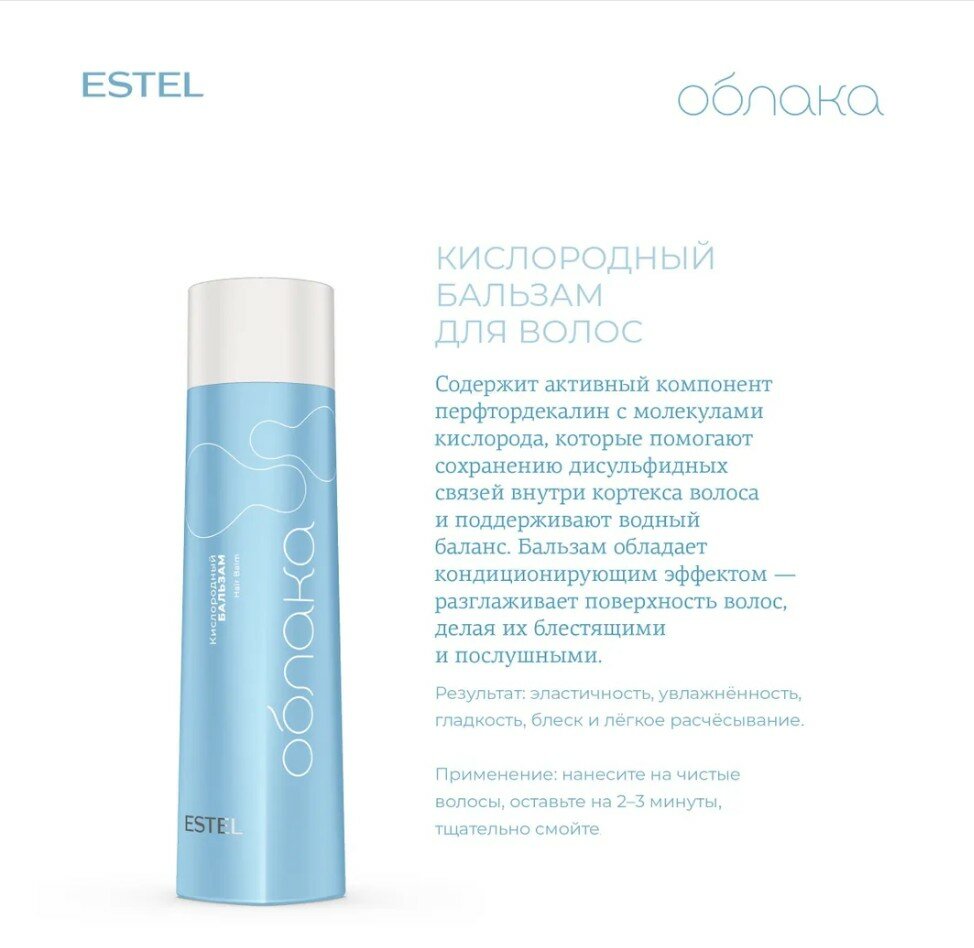 В состав косметического набора входит: Шампунь ОБЛАКА для волос и кожи головы ESTEL PROFESSIONAL кислородный 300 мл; Бальзам ОБЛАКА для волос ESTEL PROFESSIONAL кислородный 250 мл. Шампунь женский формирует воздушную, насыщенную кислородом пену, которая интенсивно и бережно очищает волосы. Содержит комплекс витаминов, микроэлементов и активный компонент перфтордекалин с молекулами кислорода, которые насыщают кожу головы и поддерживают гидролипидный баланс. Молекулы кислорода дополнительно работают как транспортер: помогают витаминному комплексу проникнуть вглубь эпидермиса.Бальзам содержит активный компонент перфтордекалин с молекулами кислорода, которые помогают сохранению дисульфидных связей внутри кортекса волоса и поддержанию водного баланса. Бальзам обладает кондиционирующим эффектом сглаживает поверхность волос, делает их блестящими и облегчает расчёсывание.