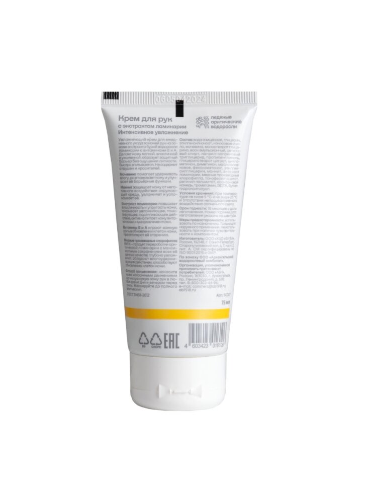 Увлажняющий крем для ежедневного ухода за кожей рук на основе экстракта бурой водоросли ламинарии с витаминами Е и А. Делает кожу мягкой, эластичной и ухоженной, образует защитный барьер без ощущения липкости. Быстро впитывается. Не содержит отдушек и красителей. Мочевина помогает удерживать влагу, разглаживает кожу и улучшает её барьерные функции. Маннит защищает кожу от негативного воздействия окружающей среды, увлажняет и успокаивает её. Экстракт ламинарии повышает эластичность и упругость кожи, оказывает увлажняющее, тонизирующее, подтягивающее действие, активно питает кожу витаминами и микроэлементами. Витамины Е и А играют важную роль в обновлении клеток кожи, препятствуют её старению. Медные производные хлорофилла (МПХ продукт переработки арктической ламинарии с максимальным сохранением всех её ценных качеств) глубоко увлажняют, обладают влагоудерживающим действием, способствуют обновлению клеток кожи.Способ применения: наносите крем массажными движениями на чистую сухую кожу рук в любое время дня и вечером перед сном. Массируйте до полного впитывания.