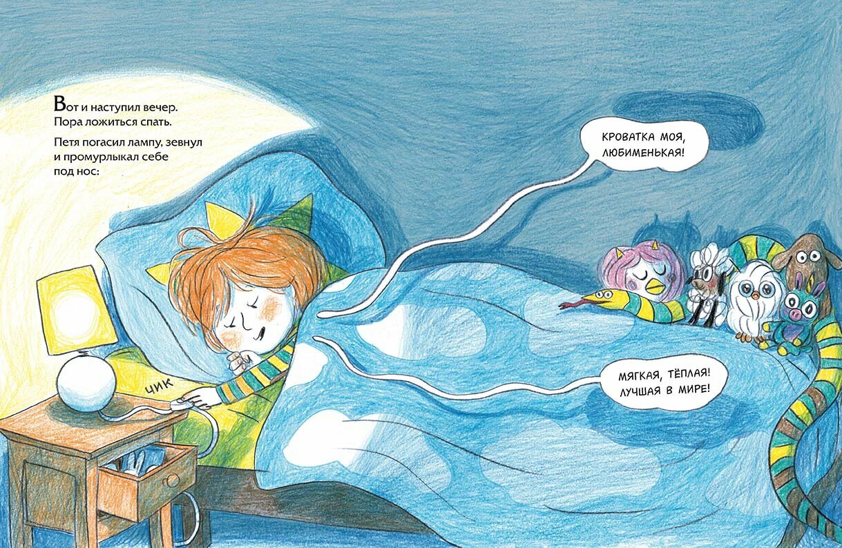 Петя никак не может уснуть — ему мешают ночные монстрики, живущие под кроватью, в шкафу и за занавеской. Интересно, почему они так расшумелись? Петя успокаивает и укладывает спать каждого монстрика и только после этого спокойно засыпает сам.