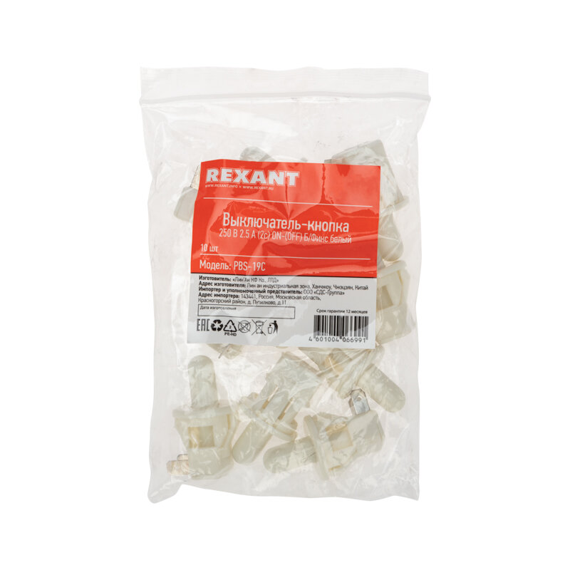 Выключатель Rexant кнопка 250V 2.5А (2с) ON-(OFF) Б/Фикс белый (PBS-19С) (мебельная) 36-3020