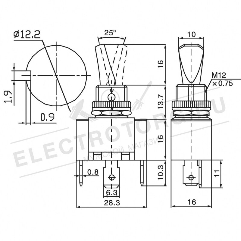 Тумблер 12V 30А (3c) ON-OFF однополюсный с синей LED подсветкой (ASW-07D-2) предназначен для коммутации электрических цепей напряжением 12В. Такая разновидность переключателей применяется на лицевых панелях в качестве комплектующих изделий различного электрооборудования (в измерительных приборах, блоках питания, электроустановках на различных производствах, легковых и грузовых автомобилях, поездах и многих других местах). Отличительной особенностью тумблера является перекидной переключатель, принцип действия которого основан на его перемещении в одну из позиций. Для переключения в нужное положение требуется приложить некоторые усилия. Монтаж осуществляется без применения винтов на плоских панелях толщиной от 0.8мм до 4мм. Подключение контактов осуществляется с помощью плоских клемм, либо с помощью пайки.