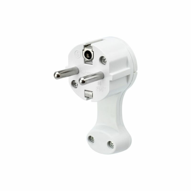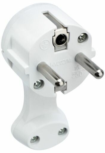 Плоская угловая вилка Евро с заземлением 16 А белая предназначена для присоединения к электрической сети различных электрических приборов бытового назначения. Позволяет произвести ремонт электрошнура в случае выхода из строя или повреждения неразборной вилки.