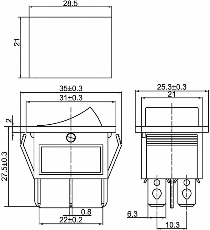 Переключатель Rexant предназначен для коммутации электрических цепей переменного тока напряжением до 250В. Клавишные (Рокерные) выключатели применяются в качестве комплектующих изделий различного электрооборудования (в сетевых фильтрах и удлинителях, аудио-оборудовании, блоках питания, электроустановках на различных производствах и многих других местах). Такой клавишный переключатель имеет два положения. Принцип действия основан на перемещении клавиши в одну из позиций. Для переключения в нужное положение требуется приложить некоторые усилия на клавишу. Монтаж осуществляется без применения винтов на плоских панелях толщиной от 0.8мм до 3мм. Подключение контактов осуществляется плоской клеммой 6.6мм либо с помощью пайки.