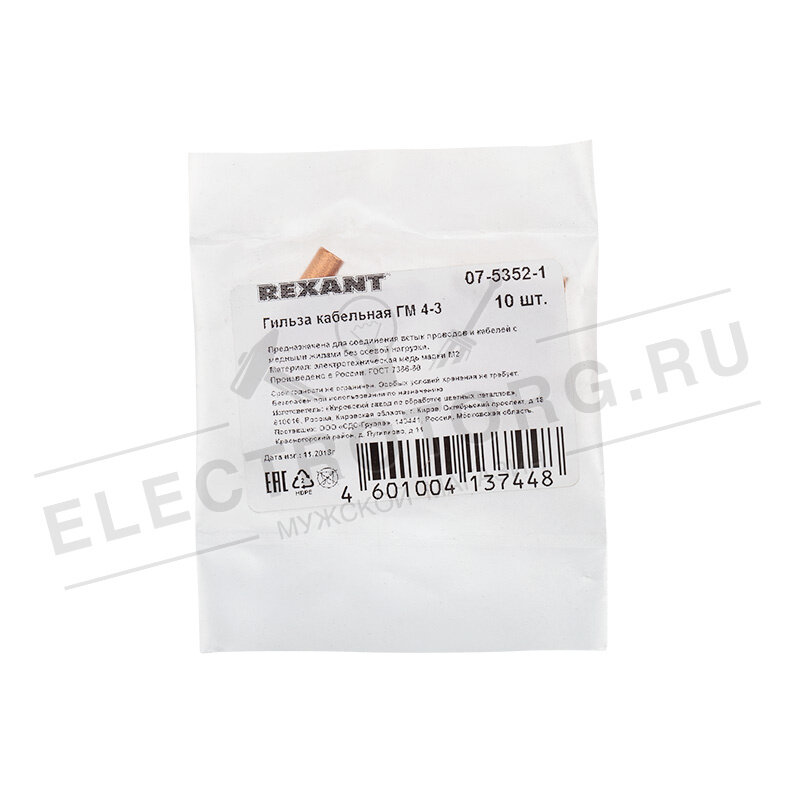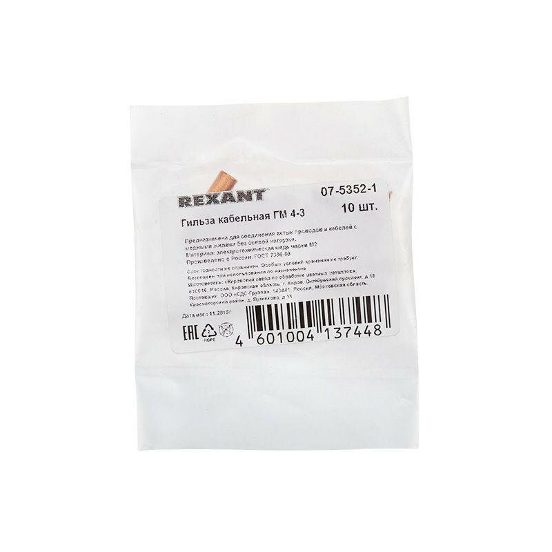Гильза REXANT ГМ 4-3 (4 мм2 - d 3 мм) упаковка 10 шт предназначена для соединения встык проводов и кабелей с медными жилами без осевой нагрузки. Изготавливается по ГОСТ 23469.3-79. Гильза имеет сквозную конструкцию. Материал: электротехническая медь марки М2.