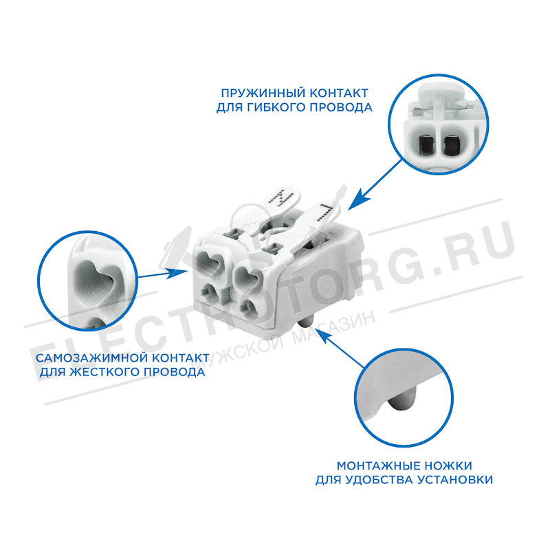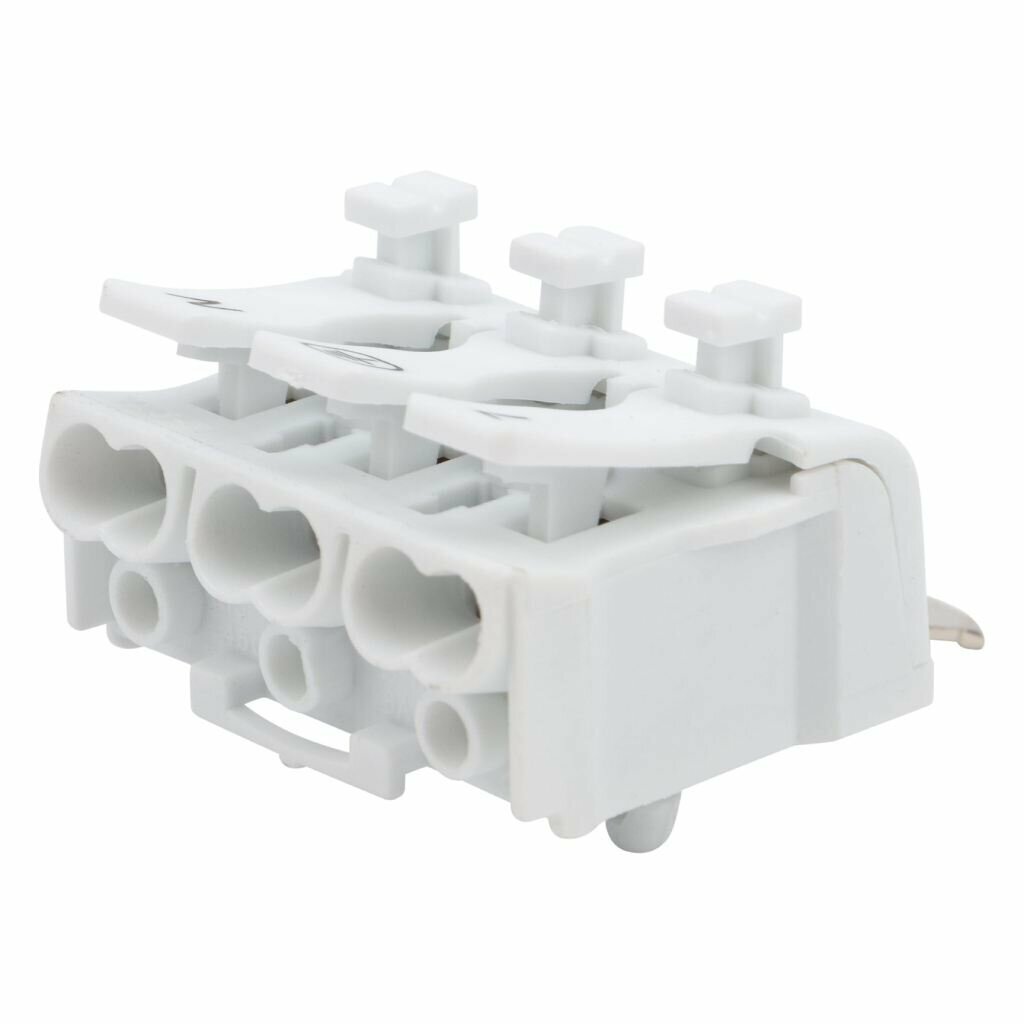 Пружинная соединительная 3-полюсная клемма REXANT КСП с заземлением и ножками 100 шт предназначена для присоединения и ответвления одножильных и многожильных медных проводников в электрических цепях переменного тока напряжением до 450 В. Наличие маркировки («фаза», «ноль», «земля») на подвижной части зажима.