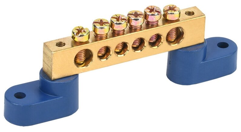 Нулевая N шина на двух угловых синих изоляторах REXANT 8х12 мм 6 групп предназначена для электрического и механического соединения нулевых, защитных и фазных проводников. Выполнена из латунной шины, установленной на пластиковые изоляторы, изготовленные из самозатухающего пластика.