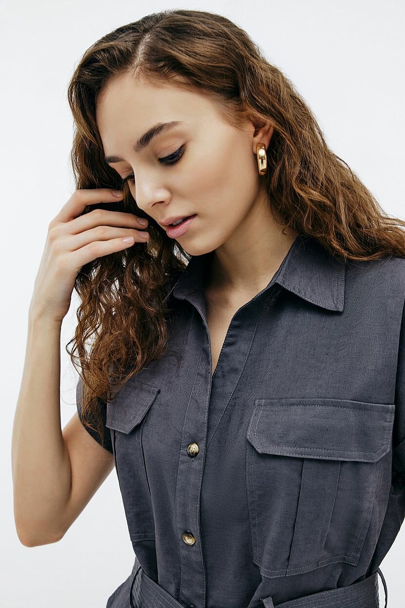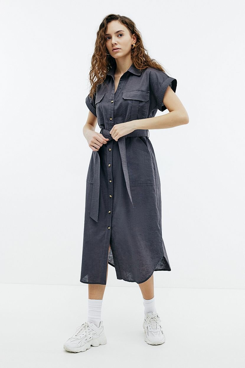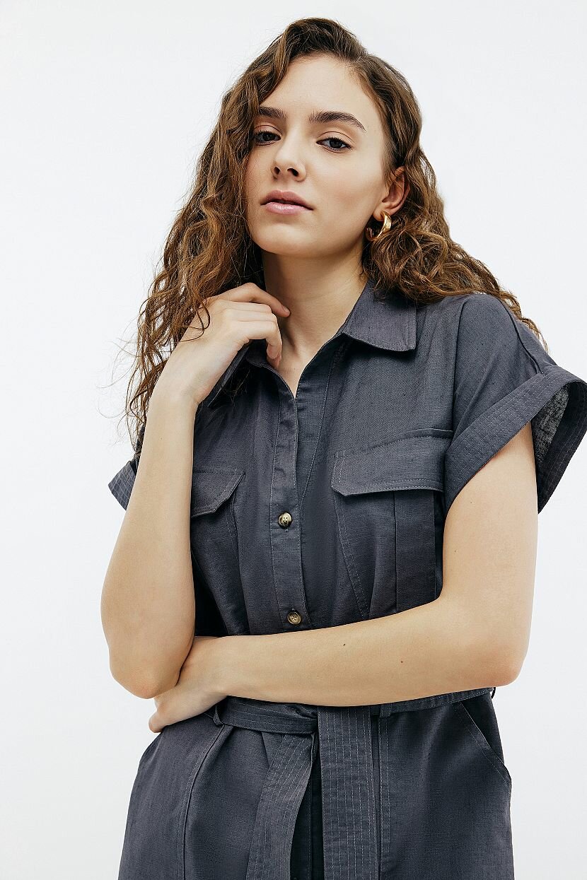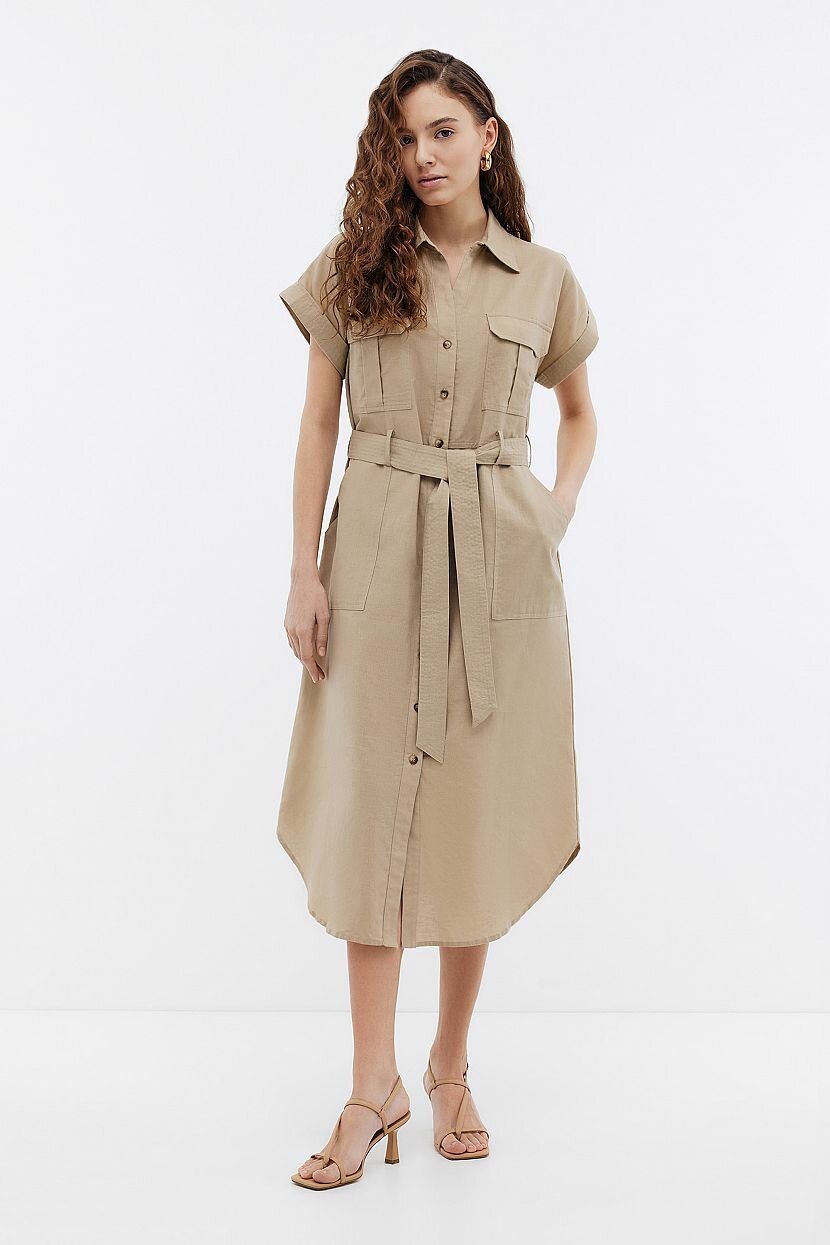 Платье прямого кроя - стильное и лаконичное решение на каждый день. Оно подойдет для прогулок и путешествий. Может быть стилизовано для офиса. Каким бы ни был повод его надеть, оно подчеркнет безупречный вкус и достоинства фигуры. Пояс из основного полотна продевается в шлевки и ставит акцент на талии. Модель рубашка с коротким рукавом в стиле сафари поможет ощутить зов приключений. В нем комфортно двигаться. Вместительные накладные карманы на груди и по бокам дают возможность разместить нужные мелочи. Закругленная линия низа и классический воротник-стойка дополняют изделие. Оно выполнено из однотонной ткани, которая объединила натуральные хлопок и лен. Материал легкий и невесомый. При этом в меру плотный и приятный на ощупь. За счет особой фактуры не требует специального ухода и отличается прочностью.
