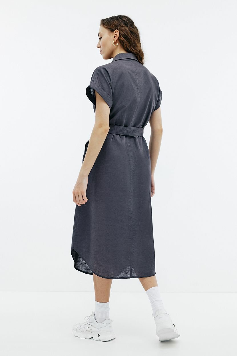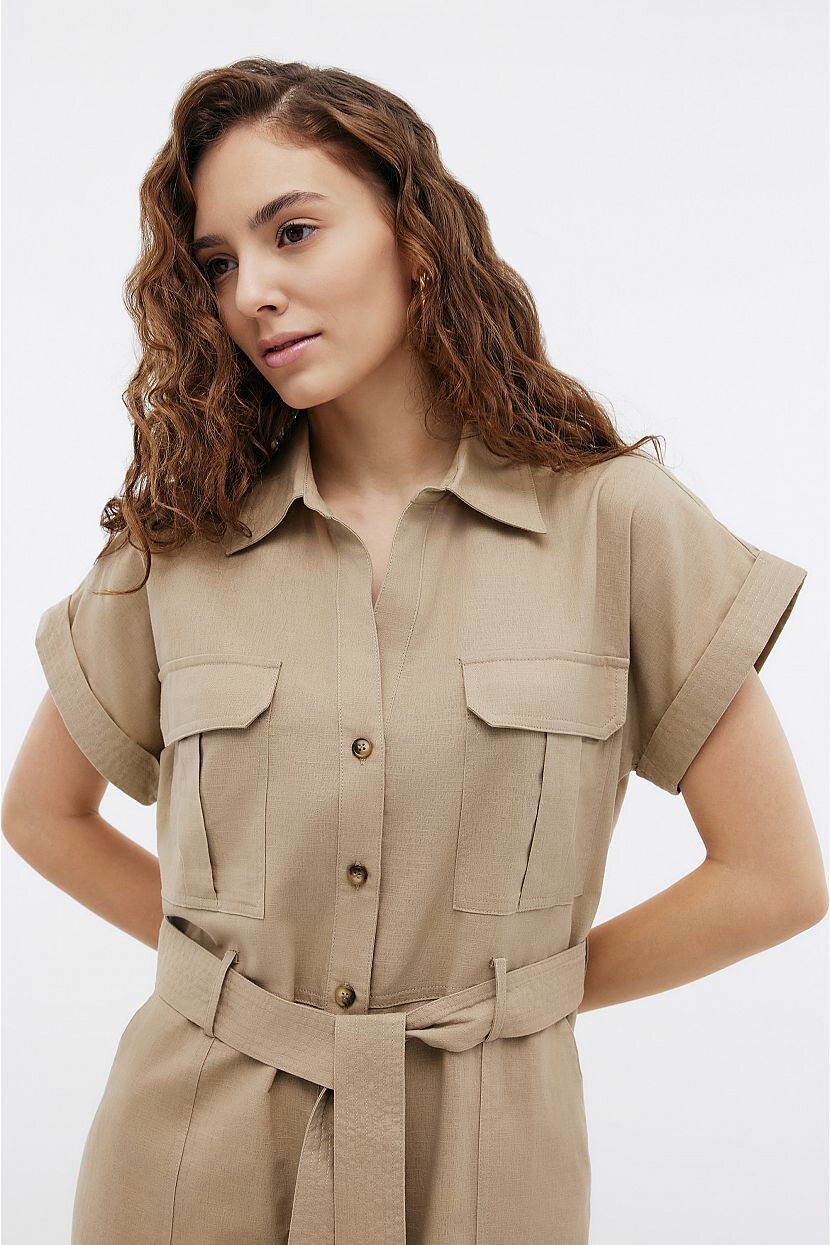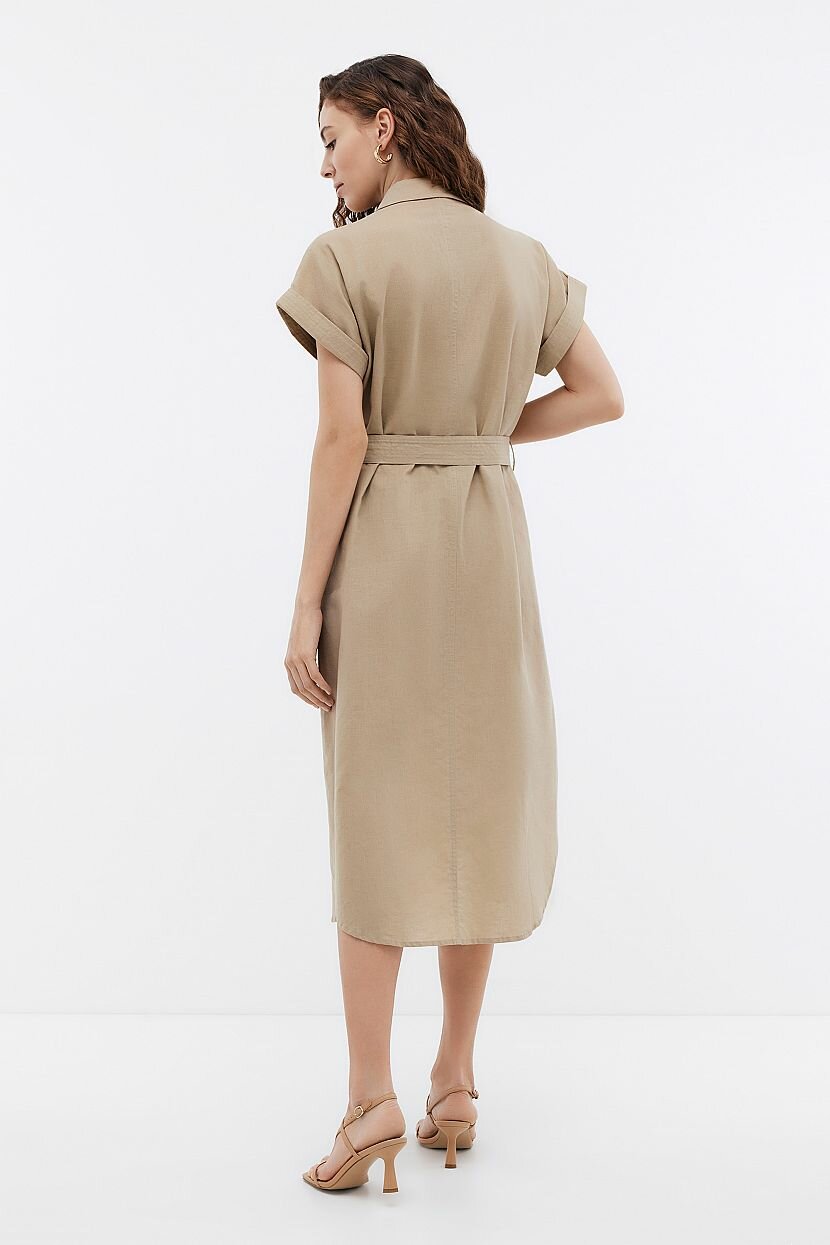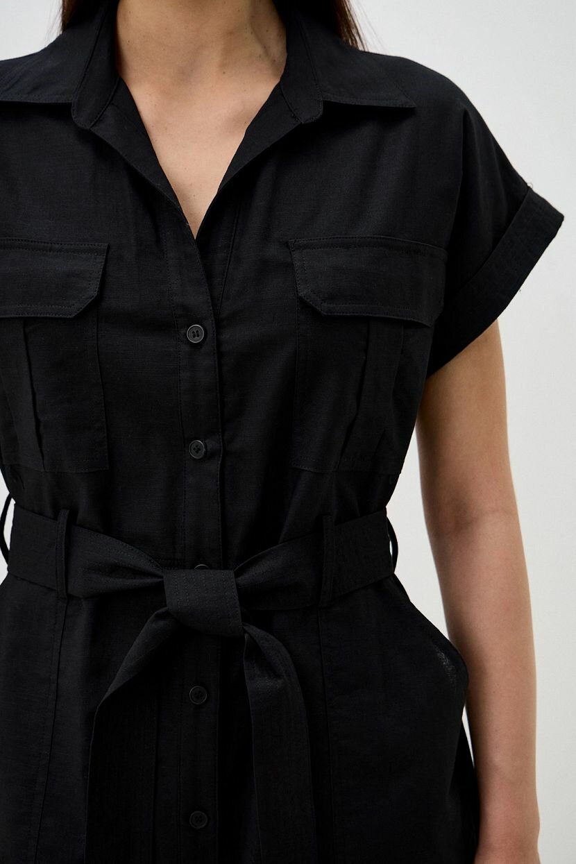 Платье прямого кроя - стильное и лаконичное решение на каждый день. Оно подойдет для прогулок и путешествий. Может быть стилизовано для офиса. Каким бы ни был повод его надеть, оно подчеркнет безупречный вкус и достоинства фигуры. Пояс из основного полотна продевается в шлевки и ставит акцент на талии. Модель рубашка с коротким рукавом в стиле сафари поможет ощутить зов приключений. В нем комфортно двигаться. Вместительные накладные карманы на груди и по бокам дают возможность разместить нужные мелочи. Закругленная линия низа и классический воротник-стойка дополняют изделие. Оно выполнено из однотонной ткани, которая объединила натуральные хлопок и лен. Материал легкий и невесомый. При этом в меру плотный и приятный на ощупь. За счет особой фактуры не требует специального ухода и отличается прочностью.