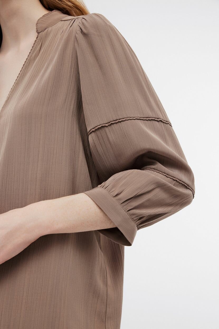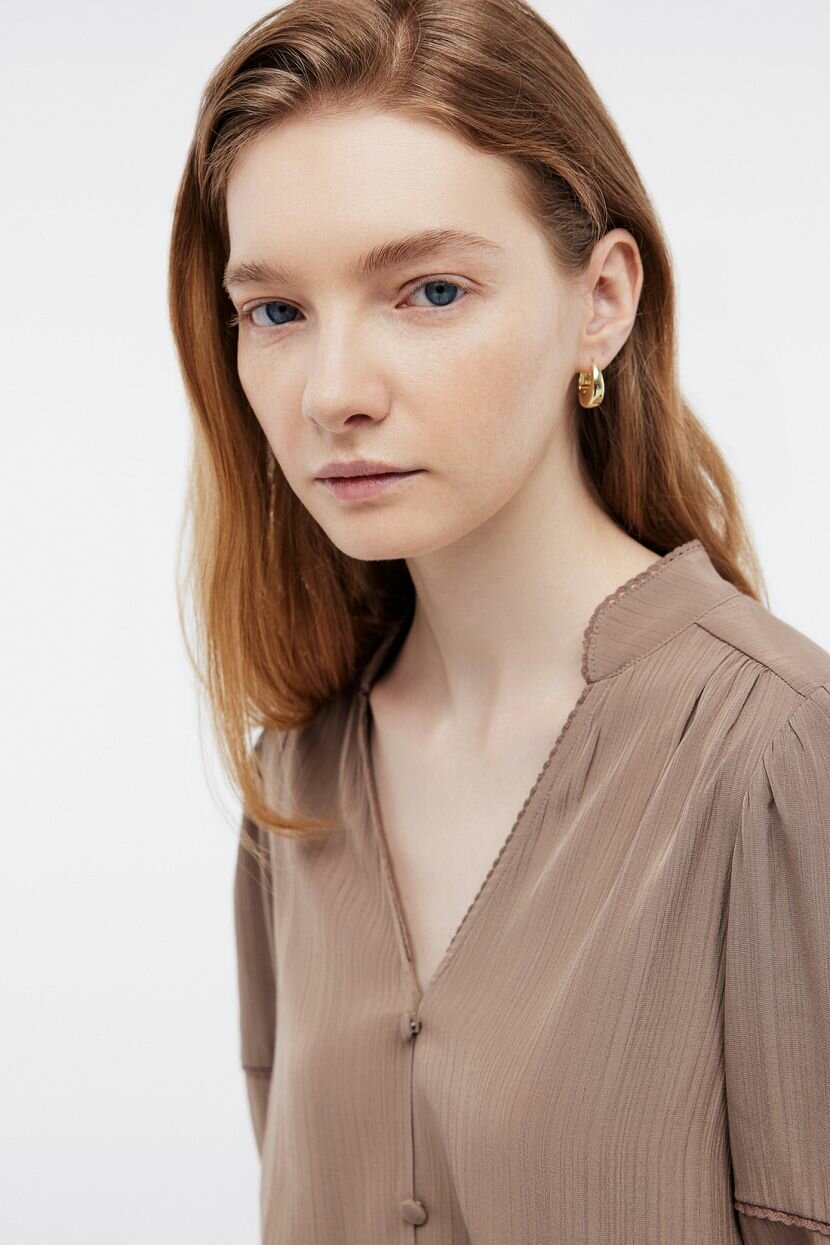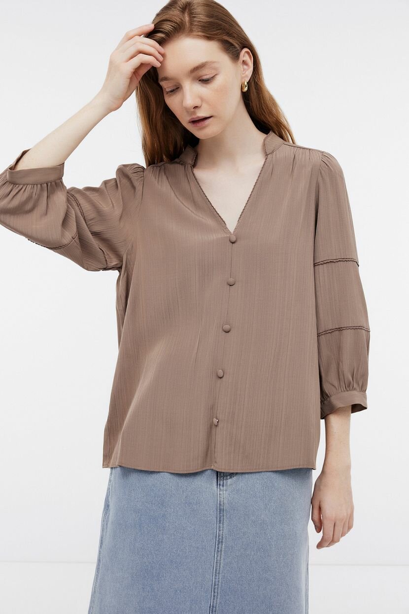 Изящная блузка в романтичном стиле способна стать основой базового гардероба настоящей бизнес-леди. Сочетание классических элементов дает возможность создавать аутфиты, которые соответствуют дресс-коду и выглядят нетривиально. Блуза станет отличным дополнением к деловым лукам. Длина до середины бедра позволяет носить ее самостоятельно или в качестве базы многослойного образа. V-образный вырез и отделка лаконичным кружевом придает женственность и утонченность. Рубашка застегивается на пуговицы, обтянутые тканью в тон изделия. Модель с длинным рукавом выполнена из легкой матовой вискозы со слегка жатым эффектом. Характерная фактура смотрится оригинально и выразительно. Тактильно приятное нежно полотно комфортно при ношении. Благодаря полиэстеру в составе материала, он обретает эластичность и красиво садится по фигуре.