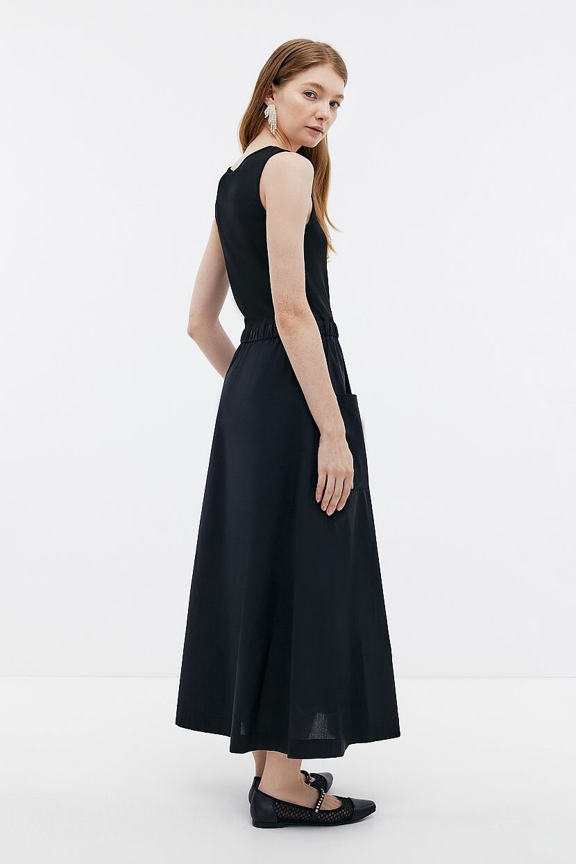 Лаконичное однотонное платье без рукавов отлично подойдет на каждый день и сделает каждый образ безупречным. Можно интегрировать в многослойные комплекты или носить самостоятельно в рамках повседневного аутфита. Неформальность и минималистичный дизайн делают его подходящим для всех случаев жизни. Сарафан приталенного кроя наделяет силуэт женственностью и утонченностью. Круглый вырез горловины и накладные карманы придают завершенность. Интересной деталью является комбинирование материалов. Верх выполнен из хлопкового фактурного трикотажа в рубчик. Юбка сшита из поплина. Хлопок обладает дышащими свойствами и мягкостью. Небольшое добавление эластана увеличивает растяжимость и обеспечивает свободу движений.